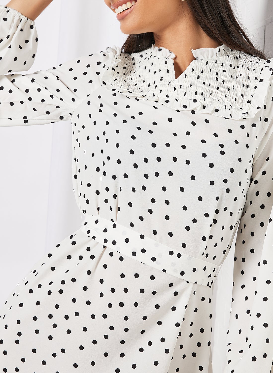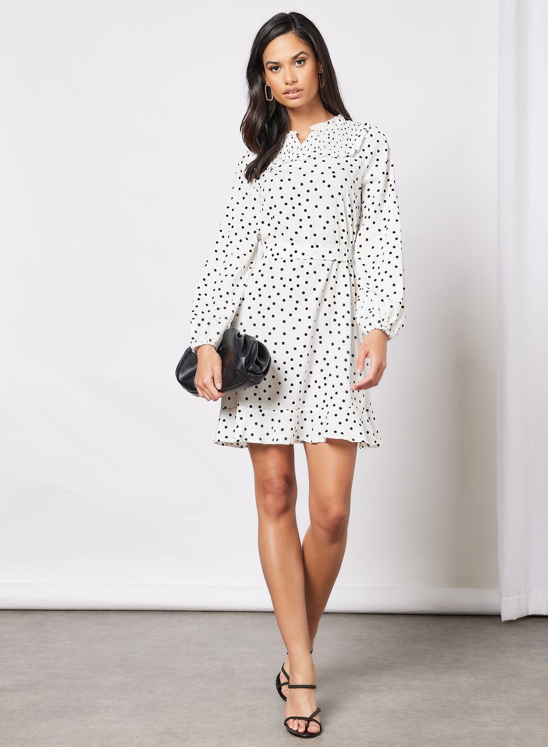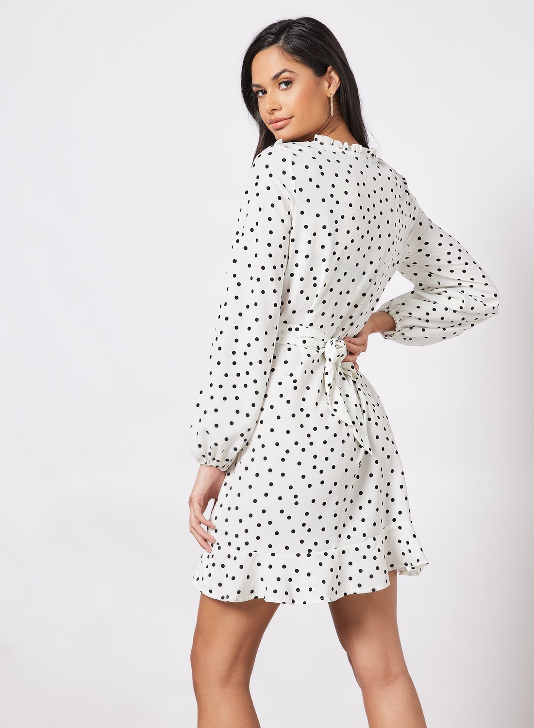 | nameOriginal | Casual Long Sleeve Mini Dress With Notch Neck Ruffle Hem Polka Dot Printed Pattern White Print |