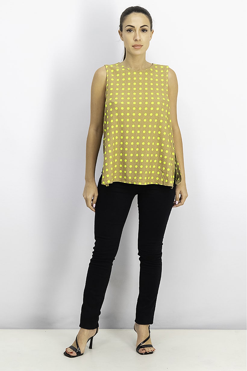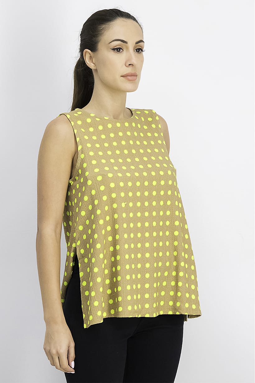 | nameOriginal | Women Round Neck Sleeveless Polka Dot Top, Tan/Lime Green |