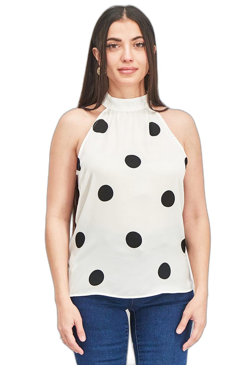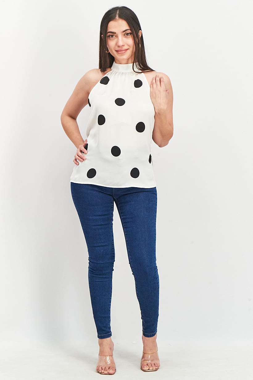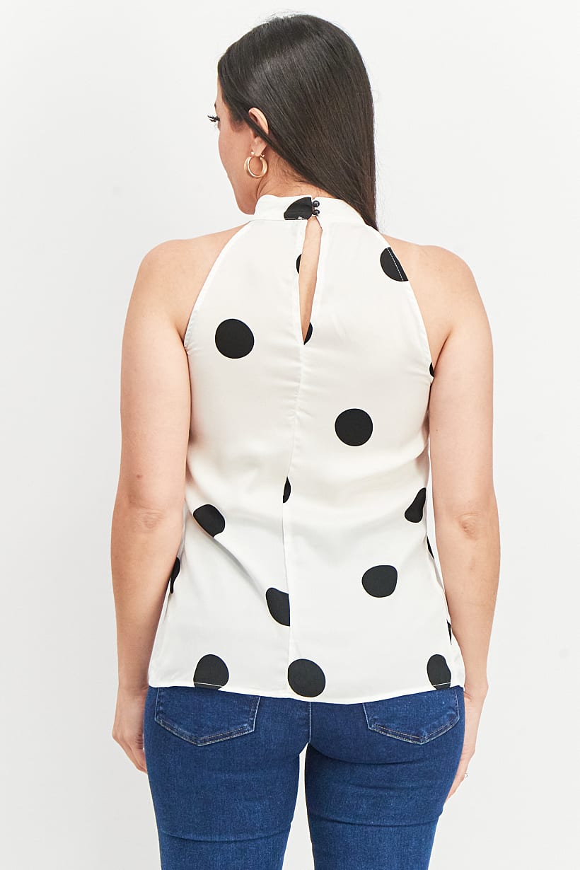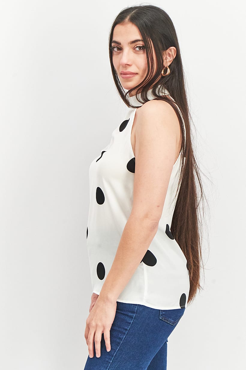 | nameOriginal | Women Choker Neckline Sleeveless Polka Dot Top, White/Black |
