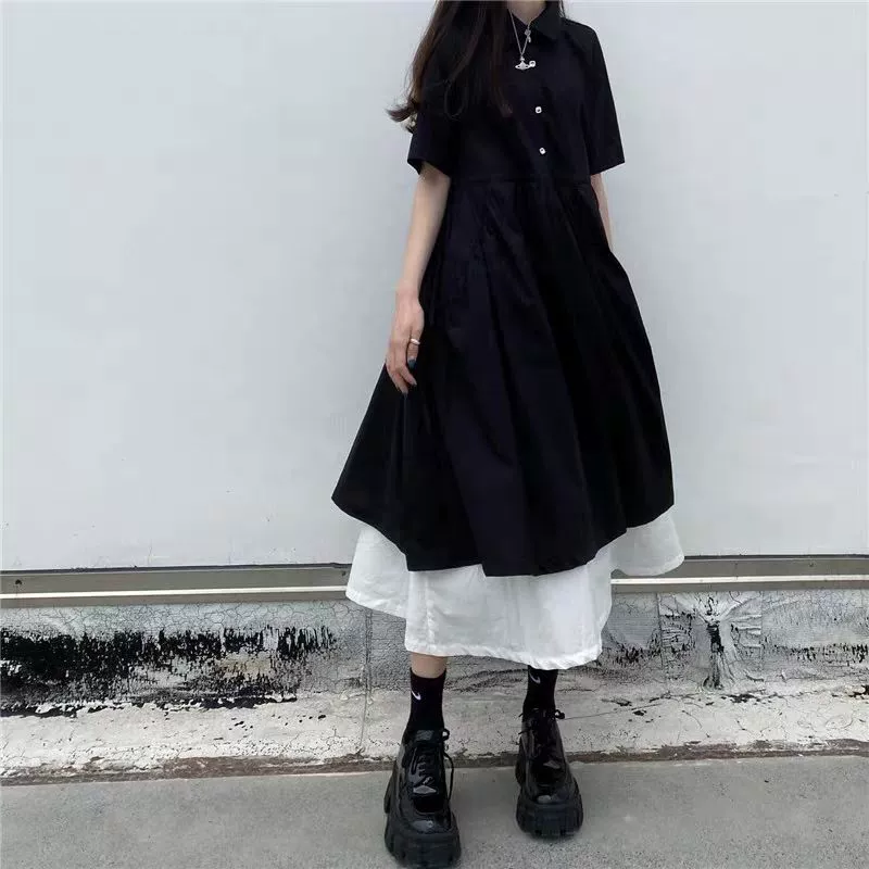 | nameOriginal | Polo collar fake two-piece large size 2-300 pounds fat mm dress summer retro slimming belly-covering waist long skirt |