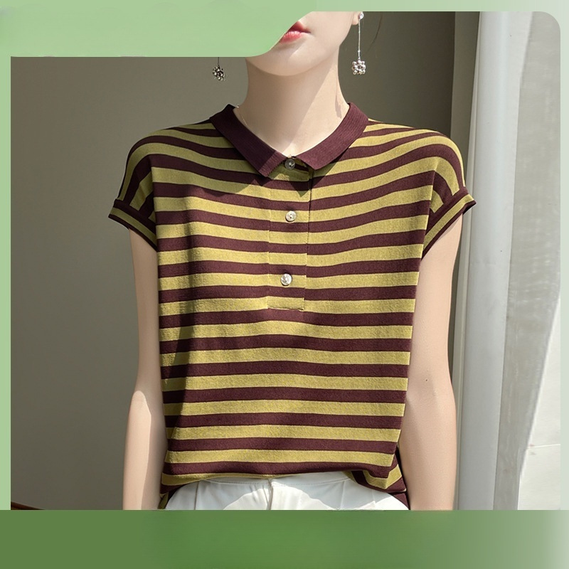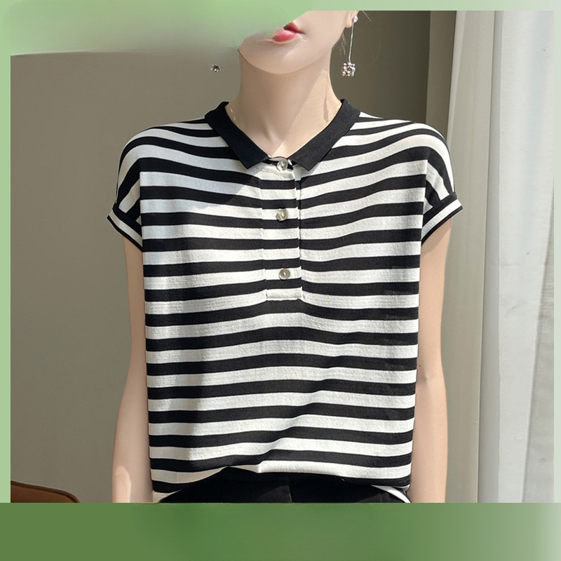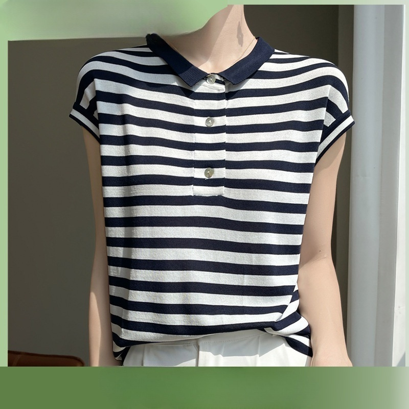 | nameOriginal | POLO Collar Knitted Short-sleeved Slim Striped T-shirt Beads Summer Thin Top Navy Blue Striped light blue Striped |