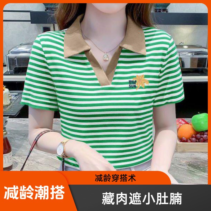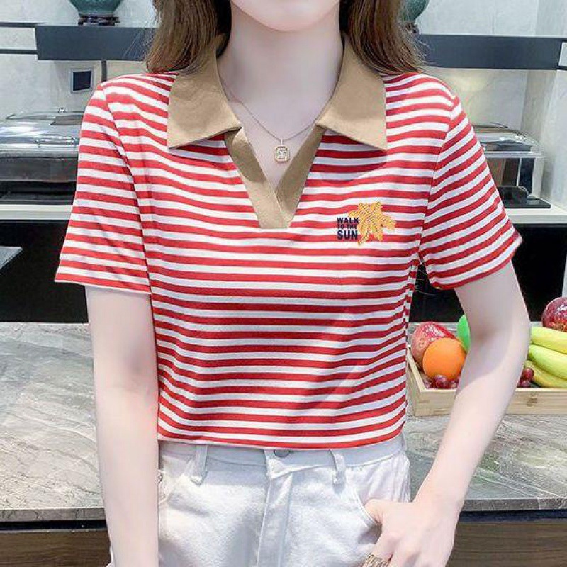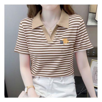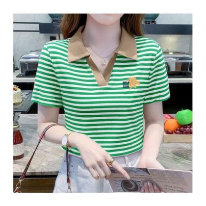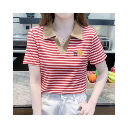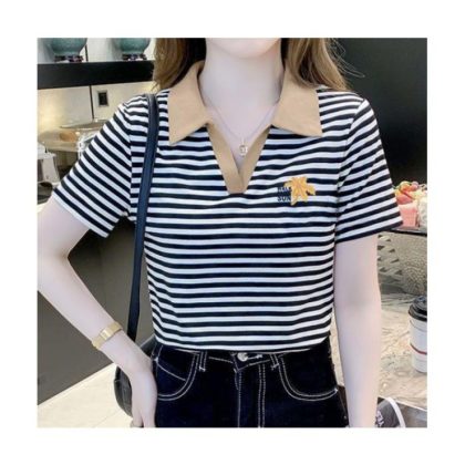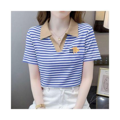 | nameOriginal | Polo Collar Short-sleeved T-shirt Women's Striped Distinctive New Fashion Stitching Contrast Color Stylish All-match Summer Casual T-shirt |