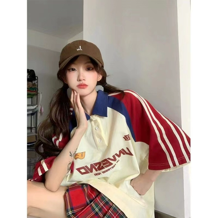 POLO large size fat girl contrasting loose short-sleeved T-shirt