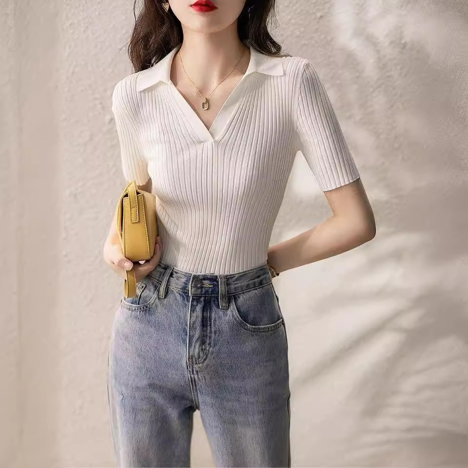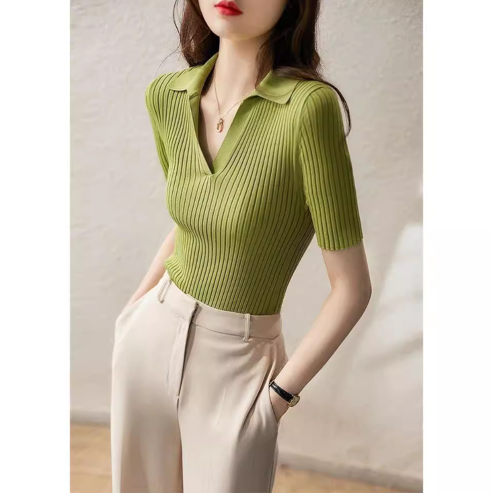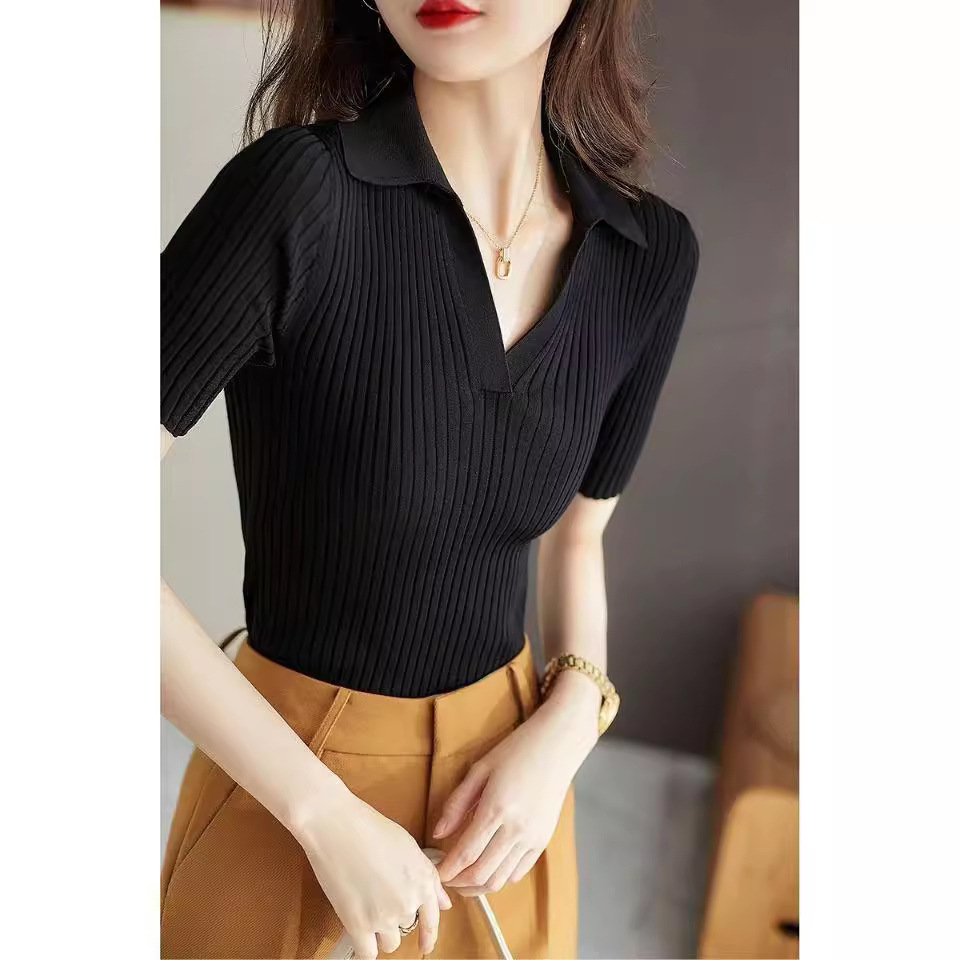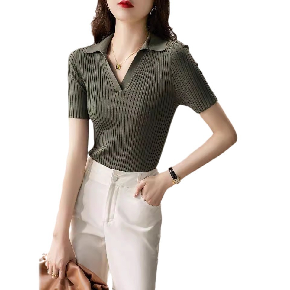 POLO Shirt Top Ice Silk Short-sleeved Women’s New All-match Western Style Bottoming Sweater Slim-fit Slimming Solid Color T-shirt for Women