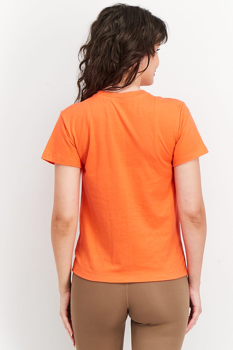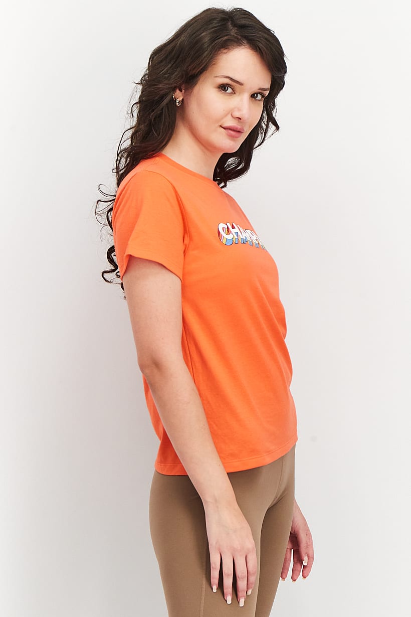 Care : Machine washable, Fit : Sportswear Fit, Ideal For : Women, Size shown : US, Sleeve Length : Short Sleeve, Thickness : Light, Type of Sport : Training, Types of Hem : Straight hem, Types of Neckline & Collar : Crew neckline, Types of Sleeve : Short sleeve, Disclaimer : Product color may slightly vary due to photographic lighting sources or your monitor settings., Fabrics : 60% Cotton, 40% Polyester, Occasion : Sport, Pattern & Print : Graphic print, Sportswear Type : T-Shirt, Types of Closures : Pullover, Color Family : Orange,
