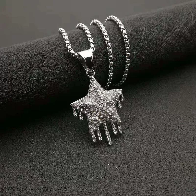 | nameOriginal | Popular European and American street hip-hop trend stainless steel water drop full diamond super flash five-pointed star pendant necklace for men and women |