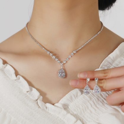 Popular two-piece necklace earrings drop-shaped zircon drop pendant simple women’s suit elegant clavicle chain