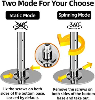 The tube has a 45mm diameter, allowing for a better grip and control of the force between the hand and the steel pipe. The PRIOR FITNESS Spinning & Static Dancing Pole kit has both spinning and static modes, which can be adjusted by inserting the tool into the hole and untwisting the screw at the bottom.