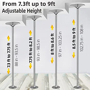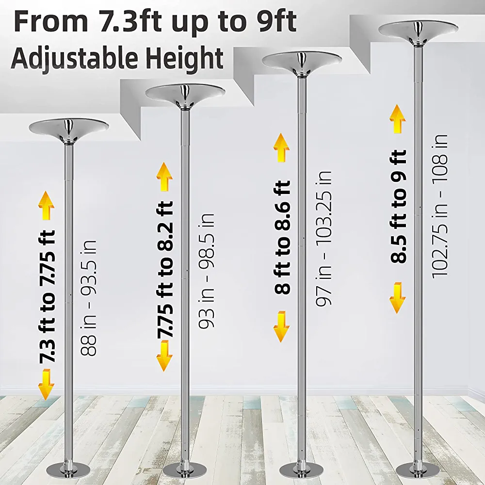 This dance pole can meet 4 different ceiling heights from 2235-2745mm. If your ceiling height is over 108 inches (2745mm), an extra extension pole of 250mm is available for purchase.