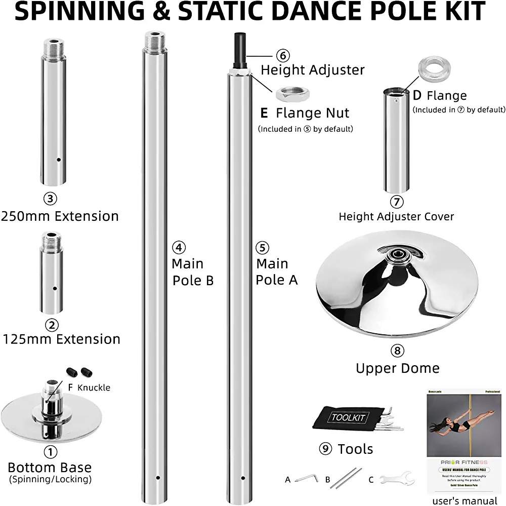 Introducing the PRIOR FITNESS Premium Spinning Dancing Pole Kit, perfect for those who want to practice pole dancing at home. This kit includes a main pole A, main pole B, 125mm and 250mm extension poles, an adjustable cover, bottom base, upper dome, and installation tools and instructions.
