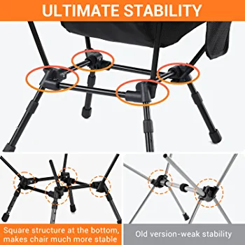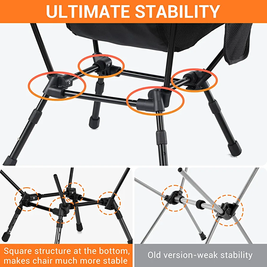 Stronger Stability: Say goodbye to an unstable camping folding chair. For ultimate stability, we've designed our camping chair with a square structure and 4 supporting points. Better still, the load capacity of this robust portable camping chair is up to 330 lbs.