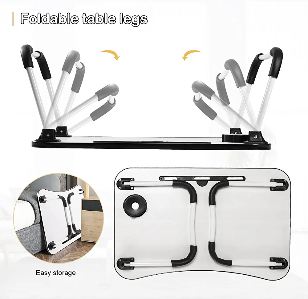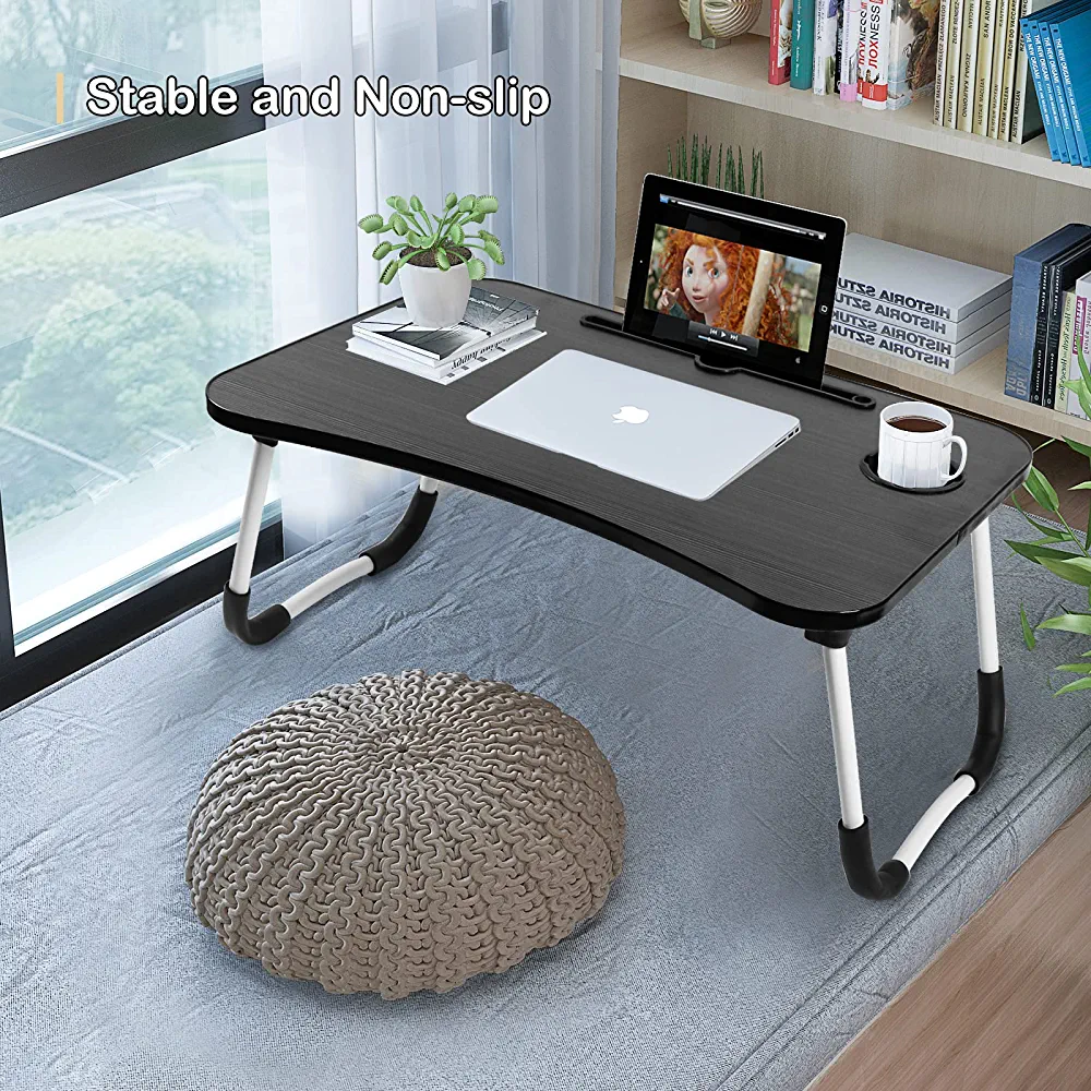 SKY-TOUCH Portable Folding Laptop Desk for Bed,With iPad and Cup Holder Adjustable Lap Tray Notebook Stand, Foldable Non-Slip Legs Reading Table Tray for working,studying,camping 60x40x28cm Black