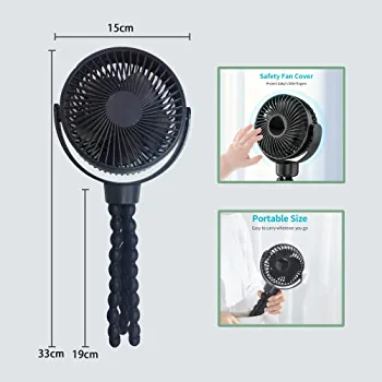 Portable Mini Fan with Flexible Tripod Clip for Baby Strollers, Car Seats, and More. Can be Powered by USB or 2000mAh Battery. Ideal for Travel, Camping, and Home Use.
