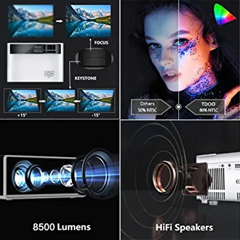 The newest built-in 5.1 Bluetooth allows you to enjoy various Bluetooth speaker sounds. However, Bluetooth does not support connecting with smartphones, only audio devices. The movie projector with keystone allows for ±15° vertical and horizontal adjustment, providing ideal square images even if the projector is off-axis or tilted up/down. You can adjust the focus to get a clear picture.