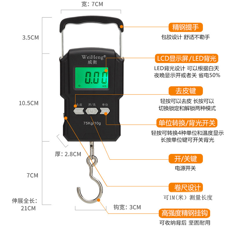 | nameOriginal | Portable scale electronic express scale 75kg with tape measure multifunctional temperature Portable Hook shopping kg scale |