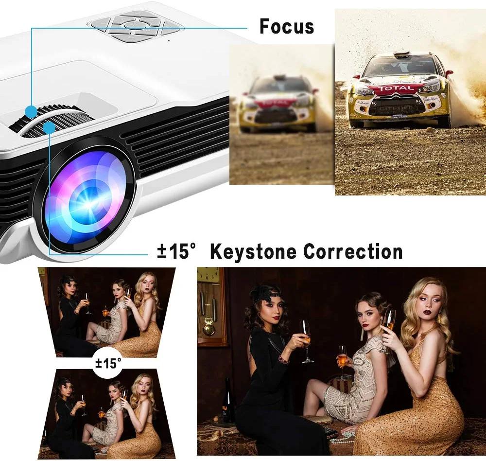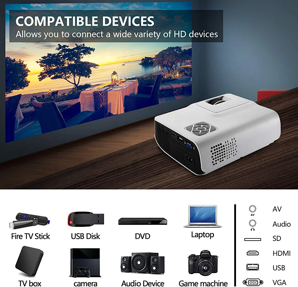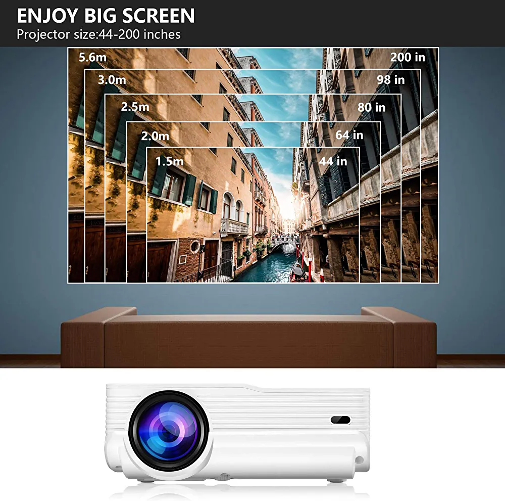 Portable video projector with 4600lux brightness, 1080P support, and 200″ display. Compatible with Fire TV Stick, PS4, HDMI, VGA, AV, and USB. Long-lasting LED lamp with 50,000 hours of life.