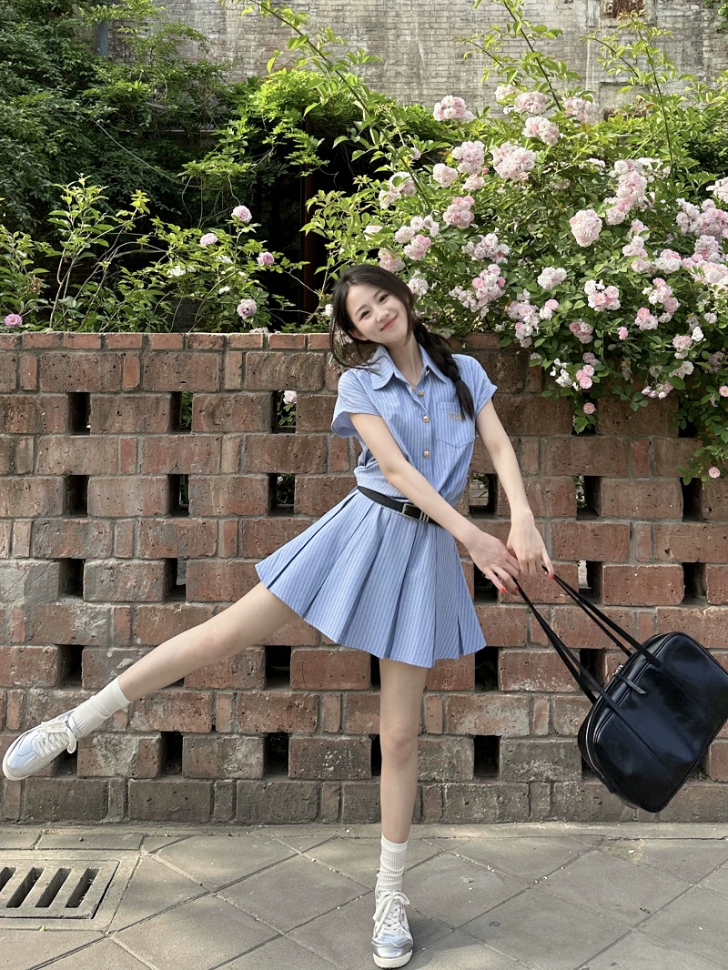 Preppy Summer Pleated Skirt A-Line Striped Shirt