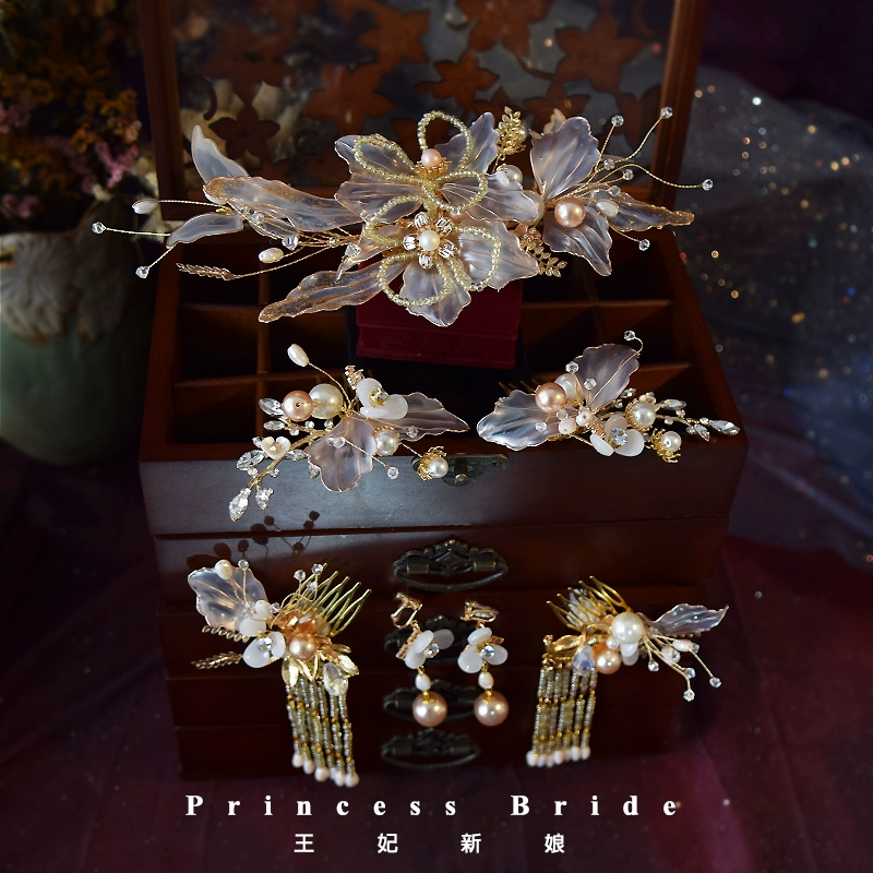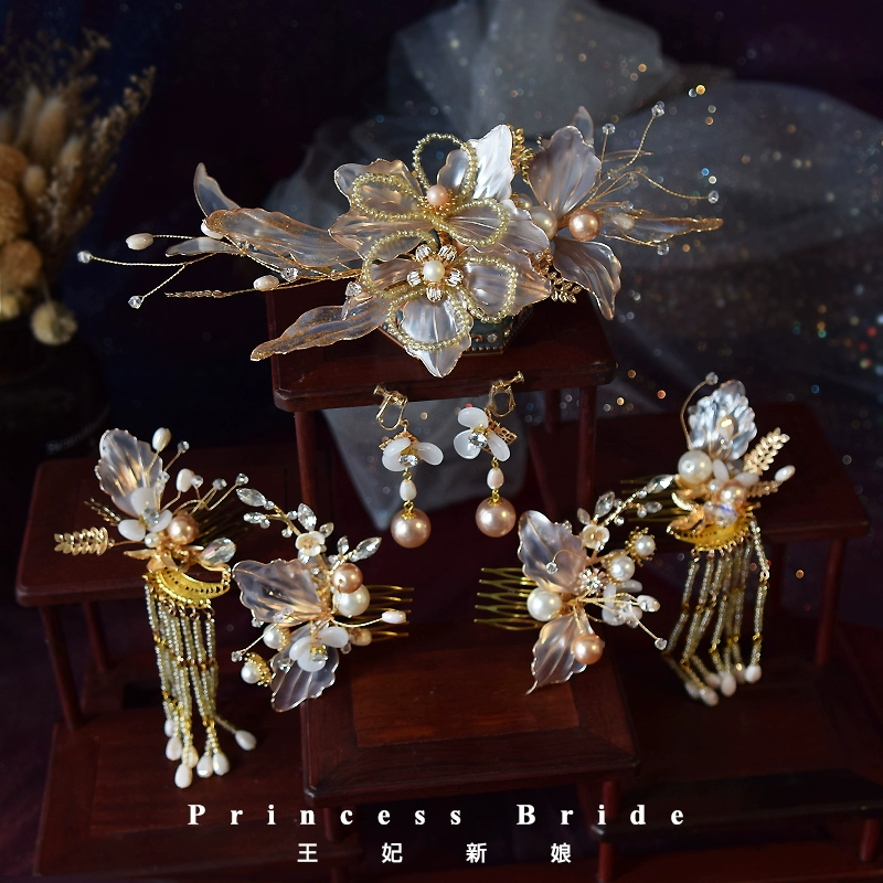 Princess Chinese style bridal flower headdress set handmade champagne color antique jewelry costume Hanfu Xiuhe hair accessories