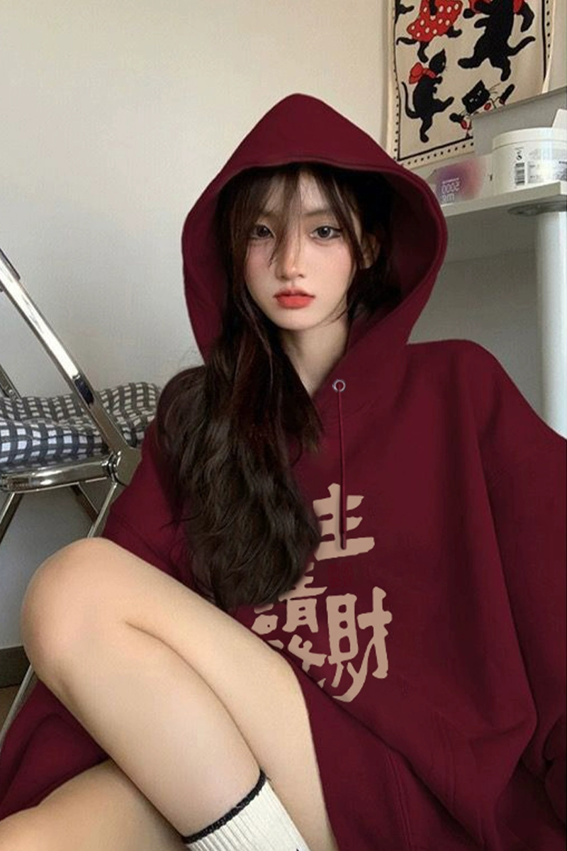 | nameOriginal | Princess, please make a fortune! 2024 New Year Burgundy Hooded Sweatshirt Women's Autumn and Winter Velvet Fun Text Printed Top |
