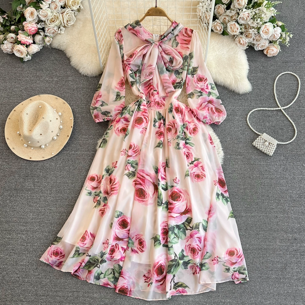 | nameOriginal | Printed chiffon dress with elegant bow ties |