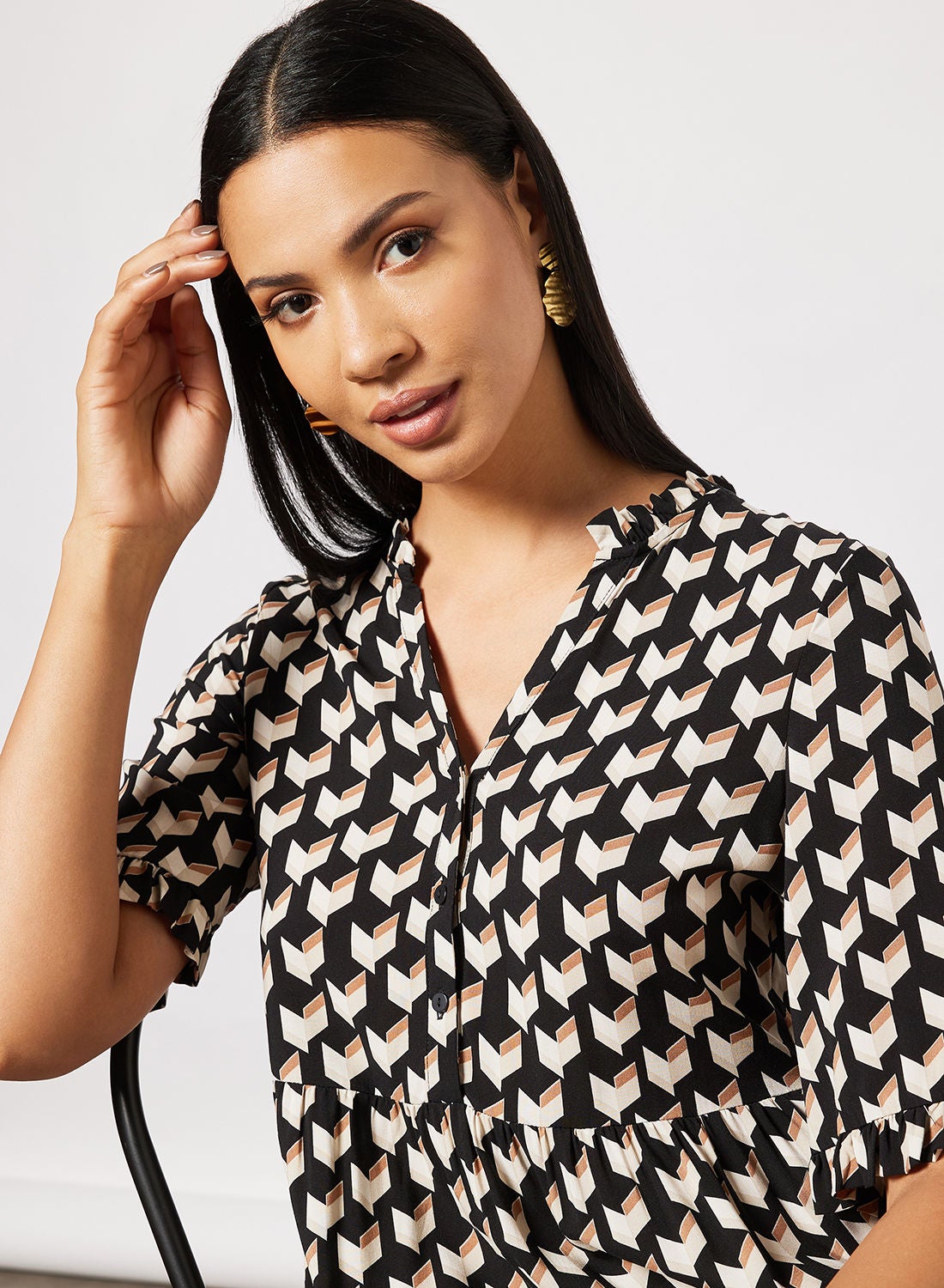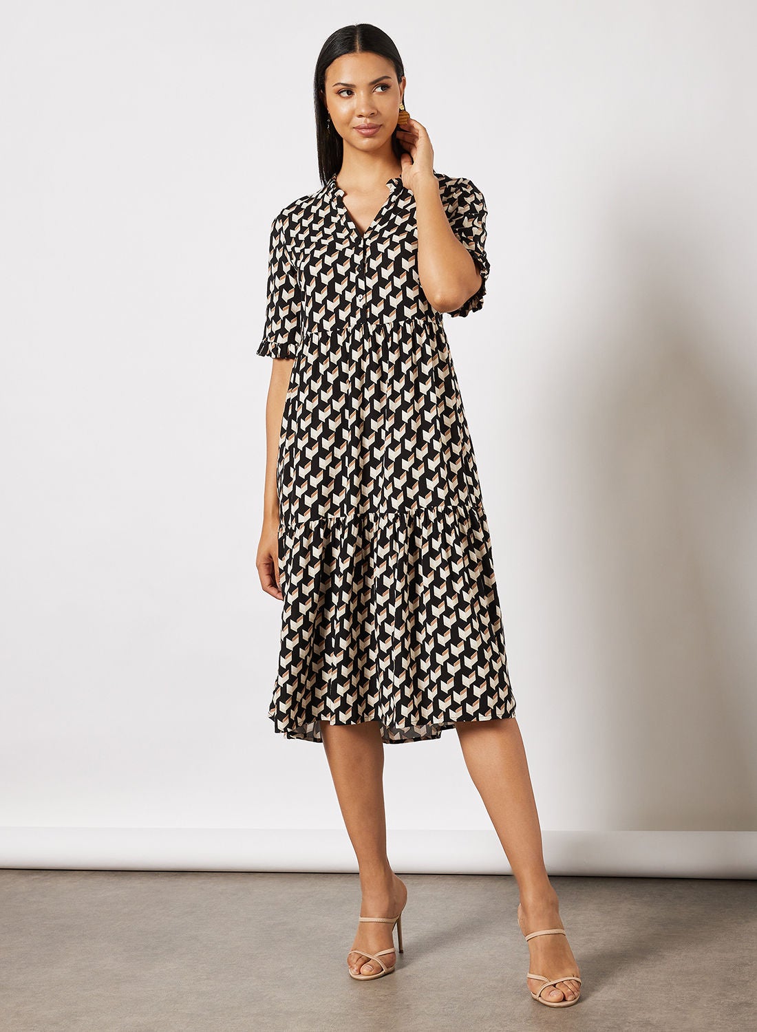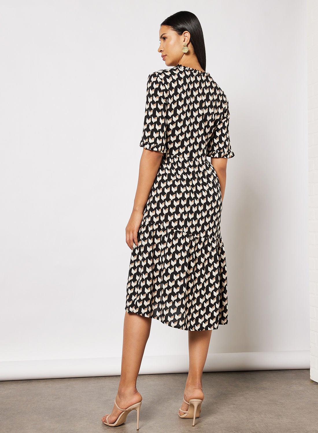 This product features a cozy and gentle viscose material with a stylish pattern print throughout. It has a V-neckline and short sleeves, along with a secure button placket at the front. The ruffle trim detail adds a touch of elegance to the relaxed fit midi-length design. Please follow the care label instructions when washing. The model is approximately 178 cm tall and is wearing a size S.