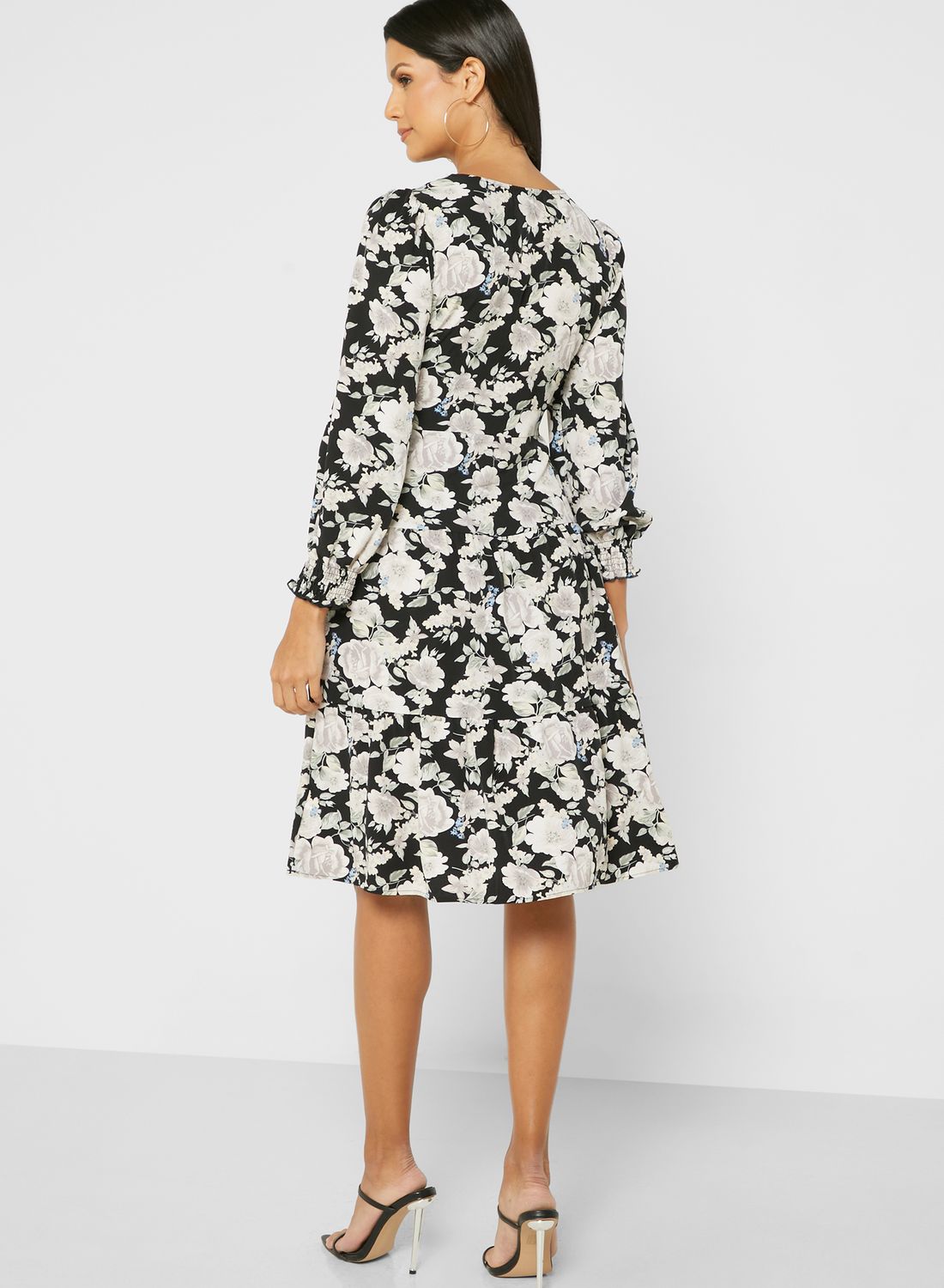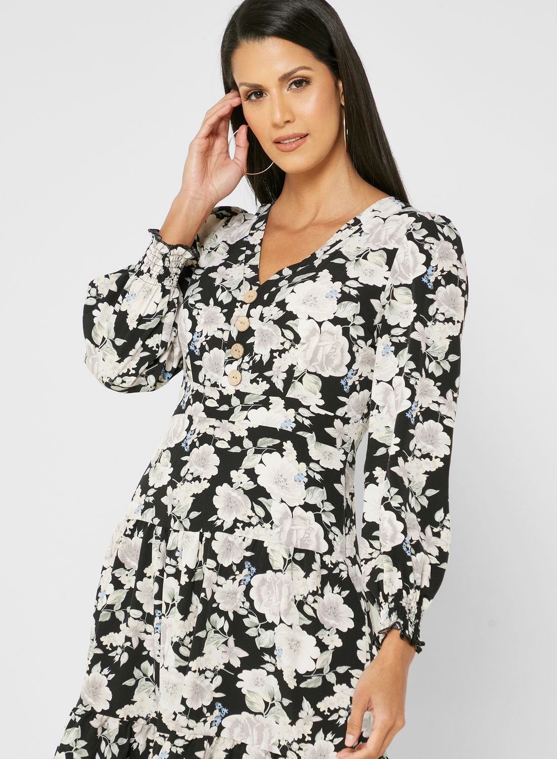 This product boasts a cozy and plush polyester material that feels great against the skin. It features a striking floral pattern that contrasts beautifully with the fabric. The V-neck and long sleeves add a touch of elegance, while the mock button placket on the front adds a touch of sophistication. The midi length, tiered design, and flared hem create a stylish and feminine silhouette.