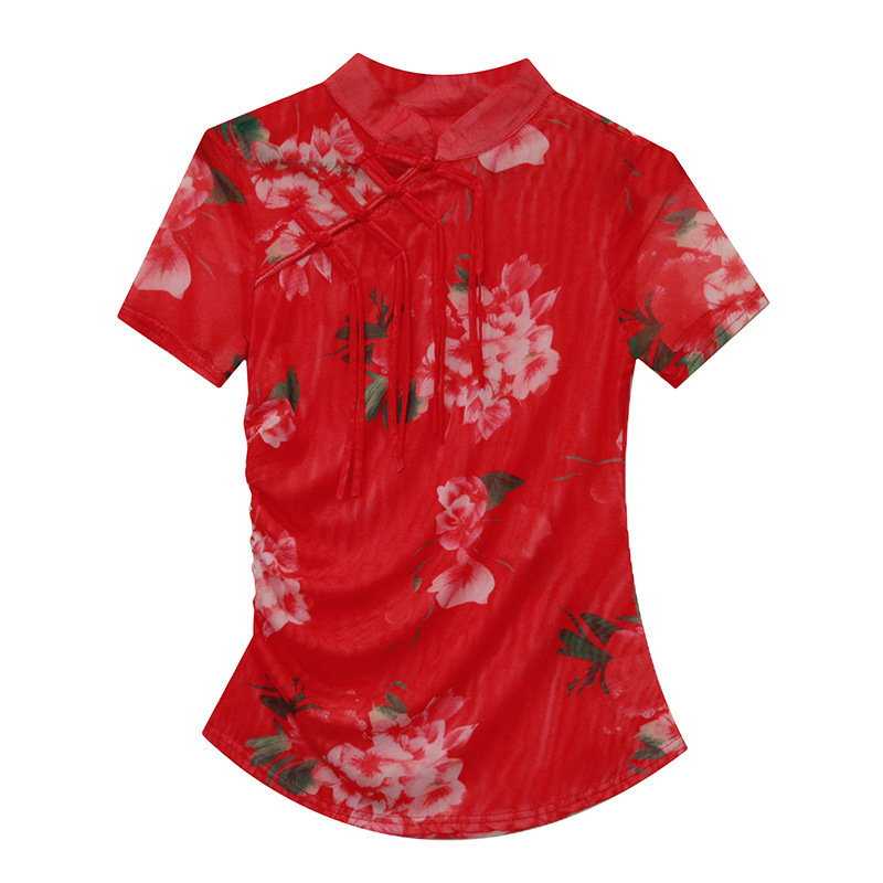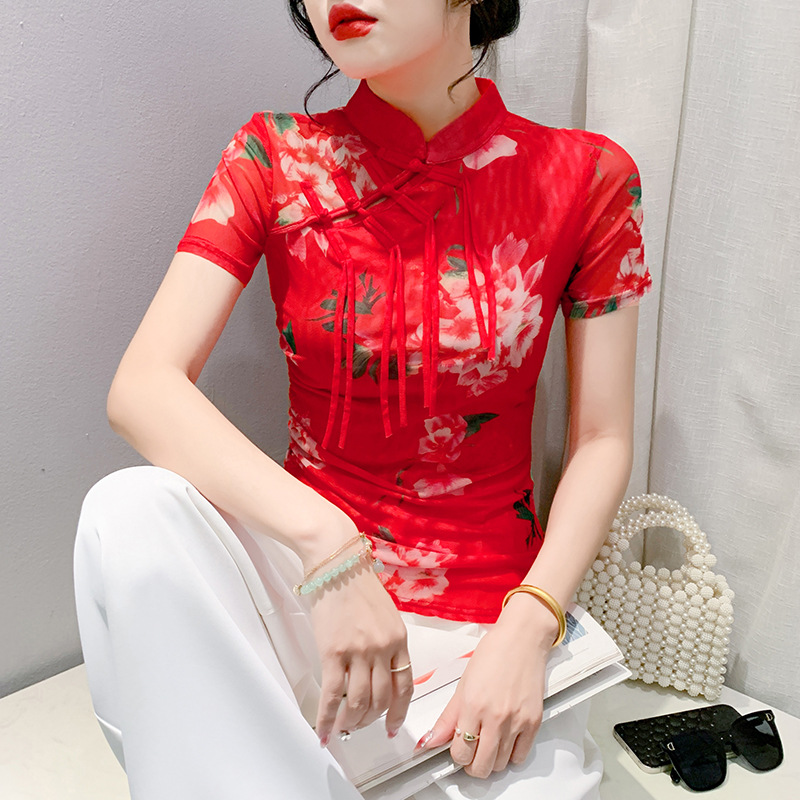 | nameOriginal | Printed Mesh T-shirt Women's Short-sleeved Summer New Chinese Style National Style Vertical Collar Buckle Top Slim-fit Red All-match Small Shirt |