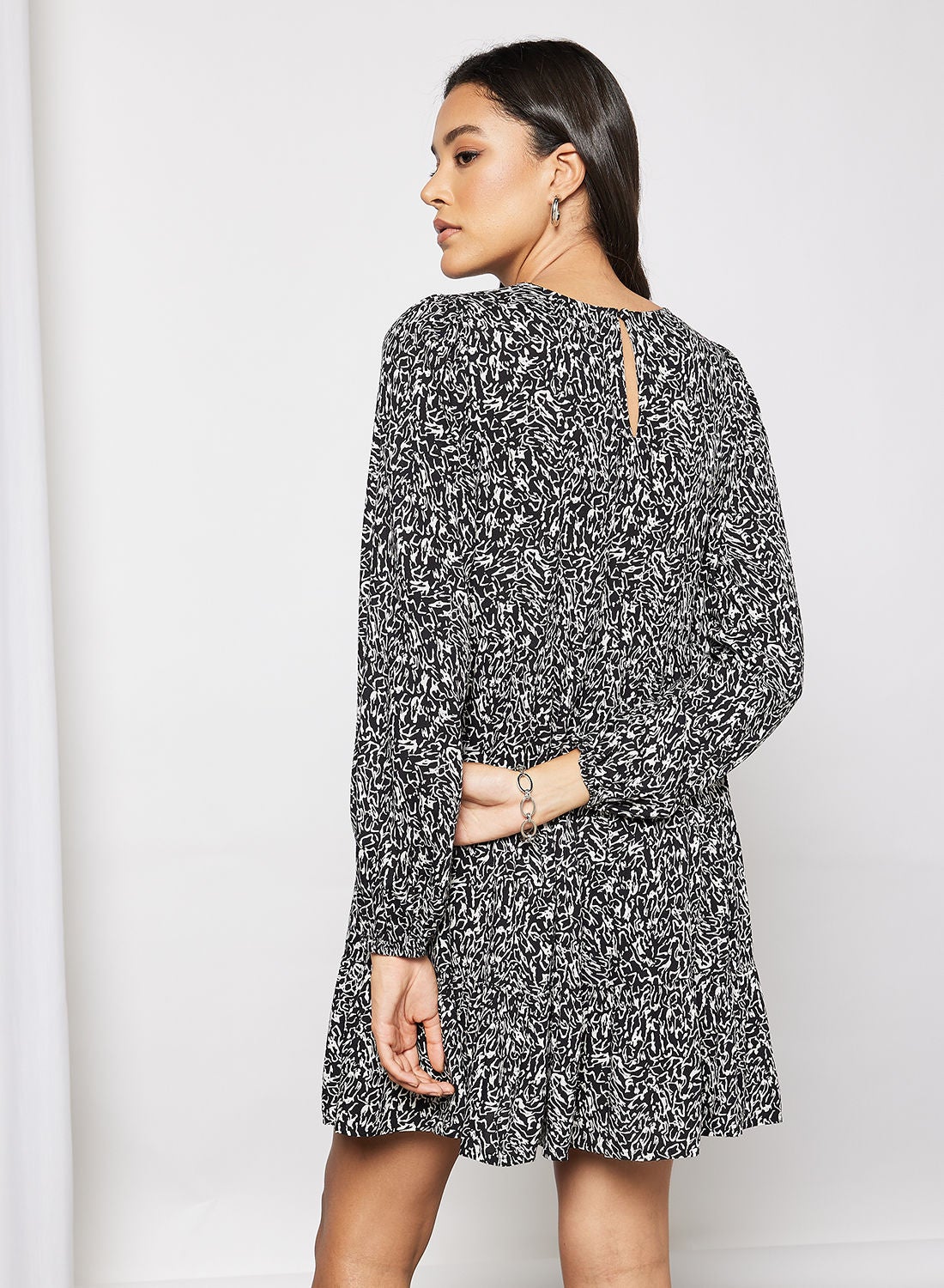 This product features a soft and lightweight viscose material that provides comfort. It has a round neckline and long puff sleeves with elastic cuffs. The back has a keyhole design with a button fastener. The hem is tiered and ruffled, adding a stylish touch. Please follow the care label instructions when washing. The model is approximately 179cm tall and is wearing a size S.