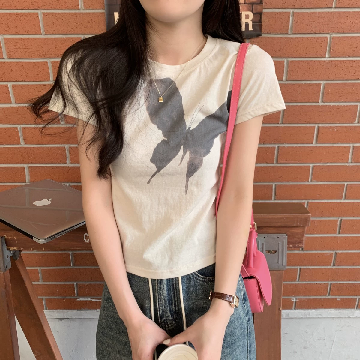 Printed right shoulder cotton slim fit top short sleeve t-shirt