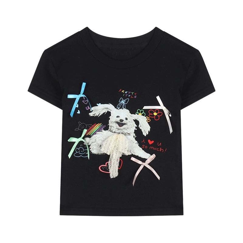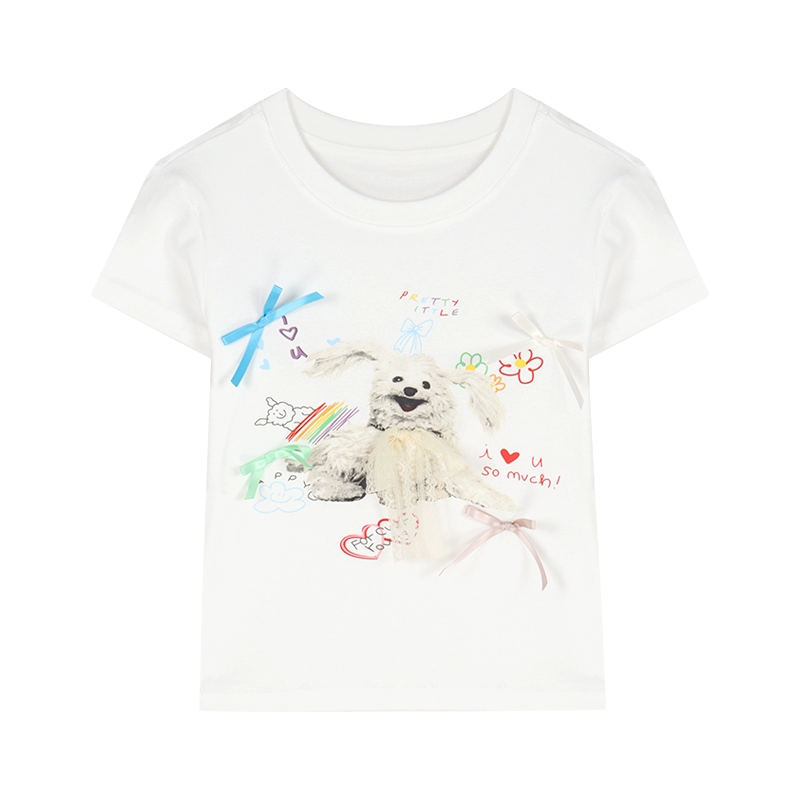 | nameOriginal | Printed round neck short sleeve slim white top with bow tie |