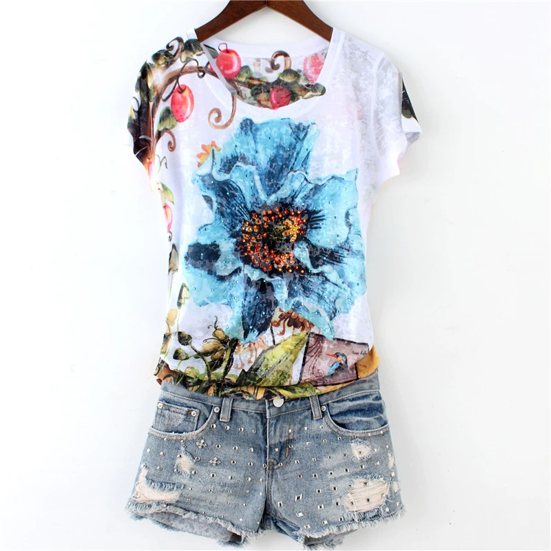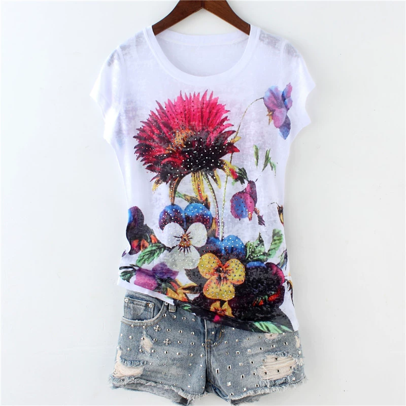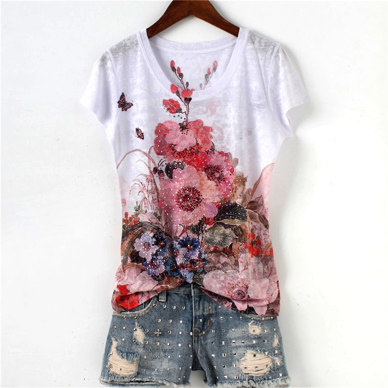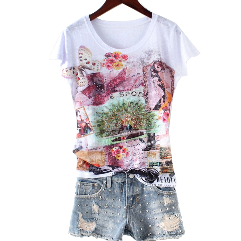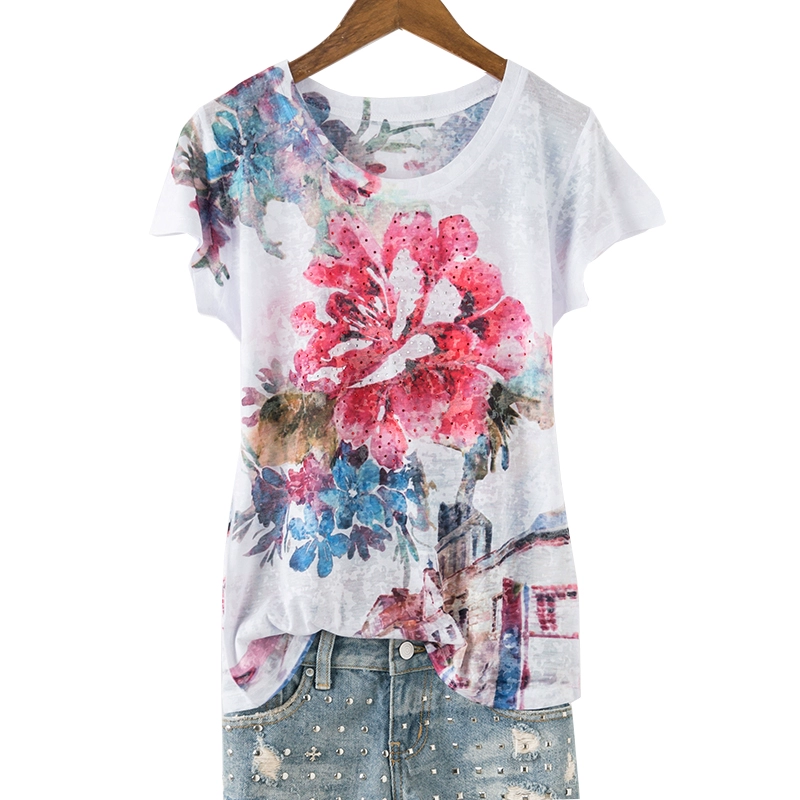 | nameOriginal | Printed thin short-sleeved slim round neck top with rhinestones |