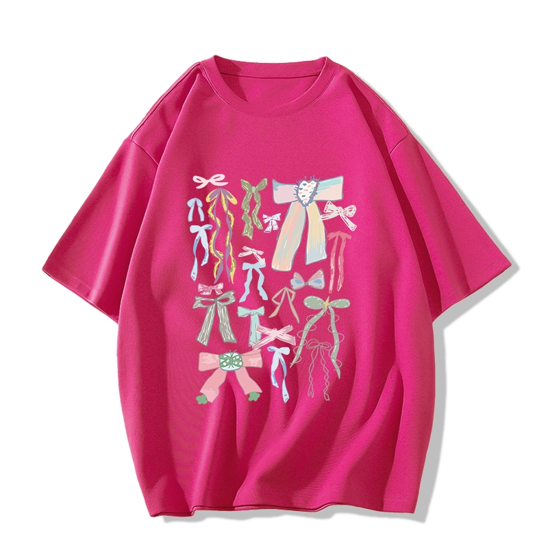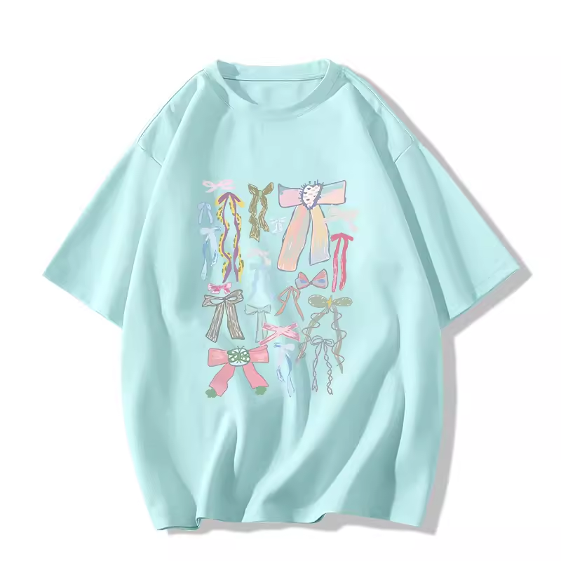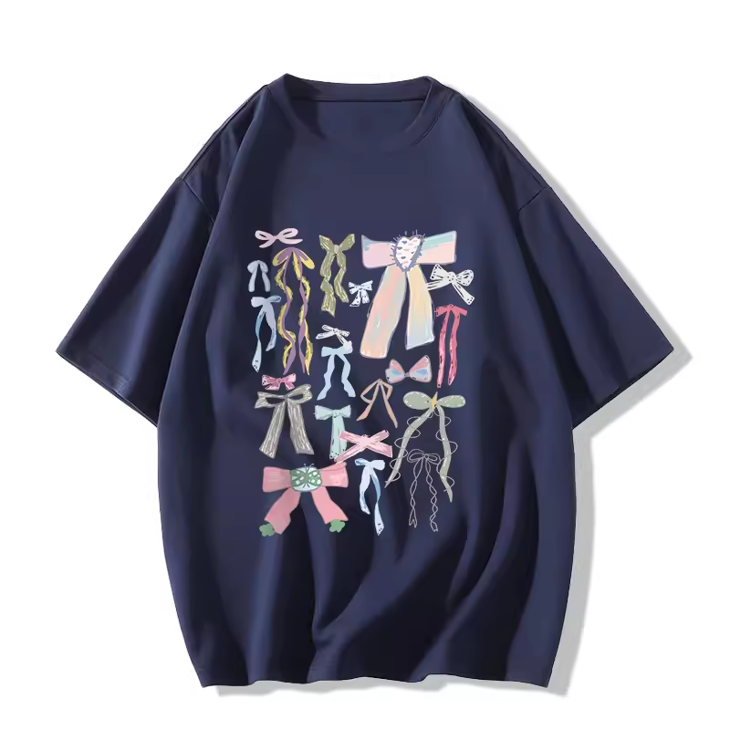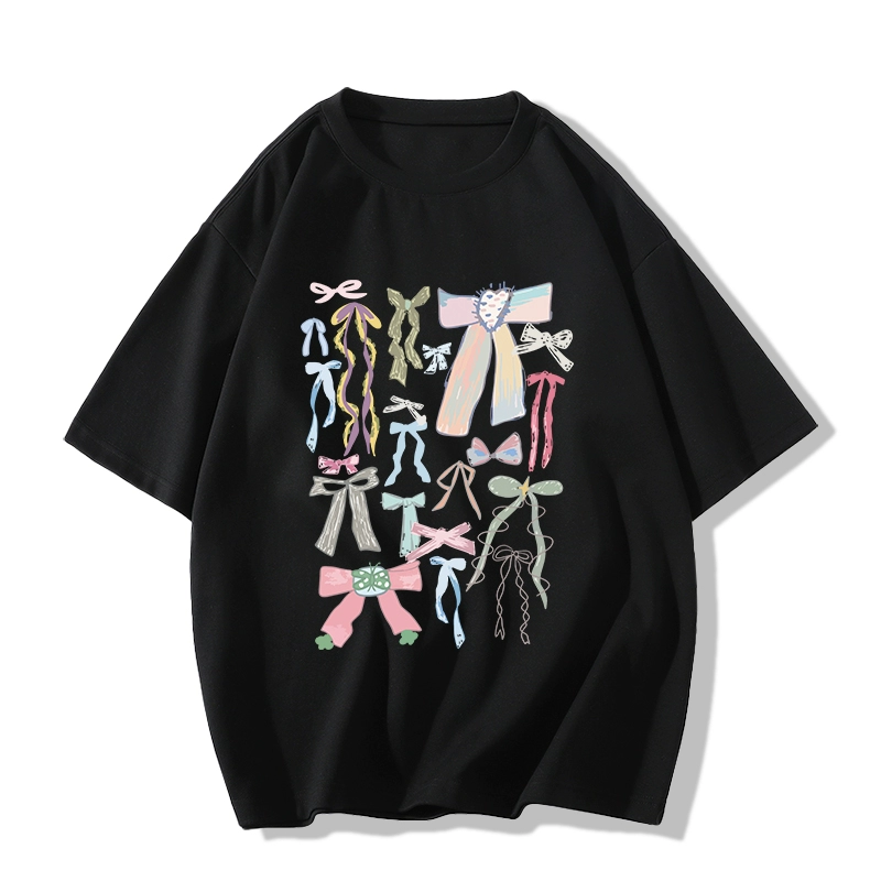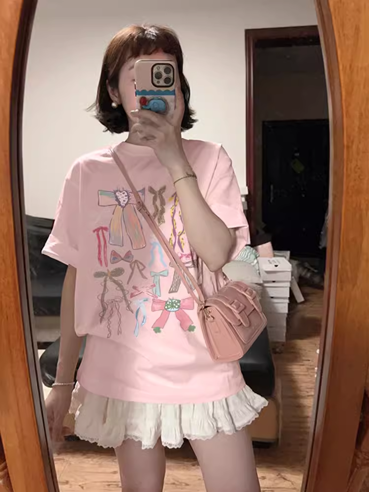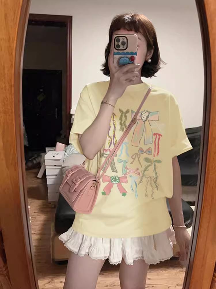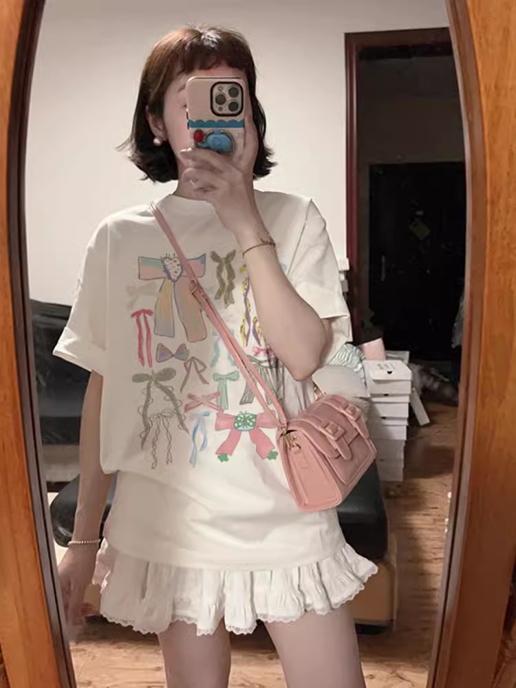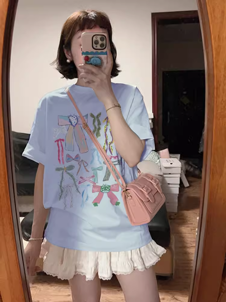 Printed white cotton short-sleeved loose casual bow