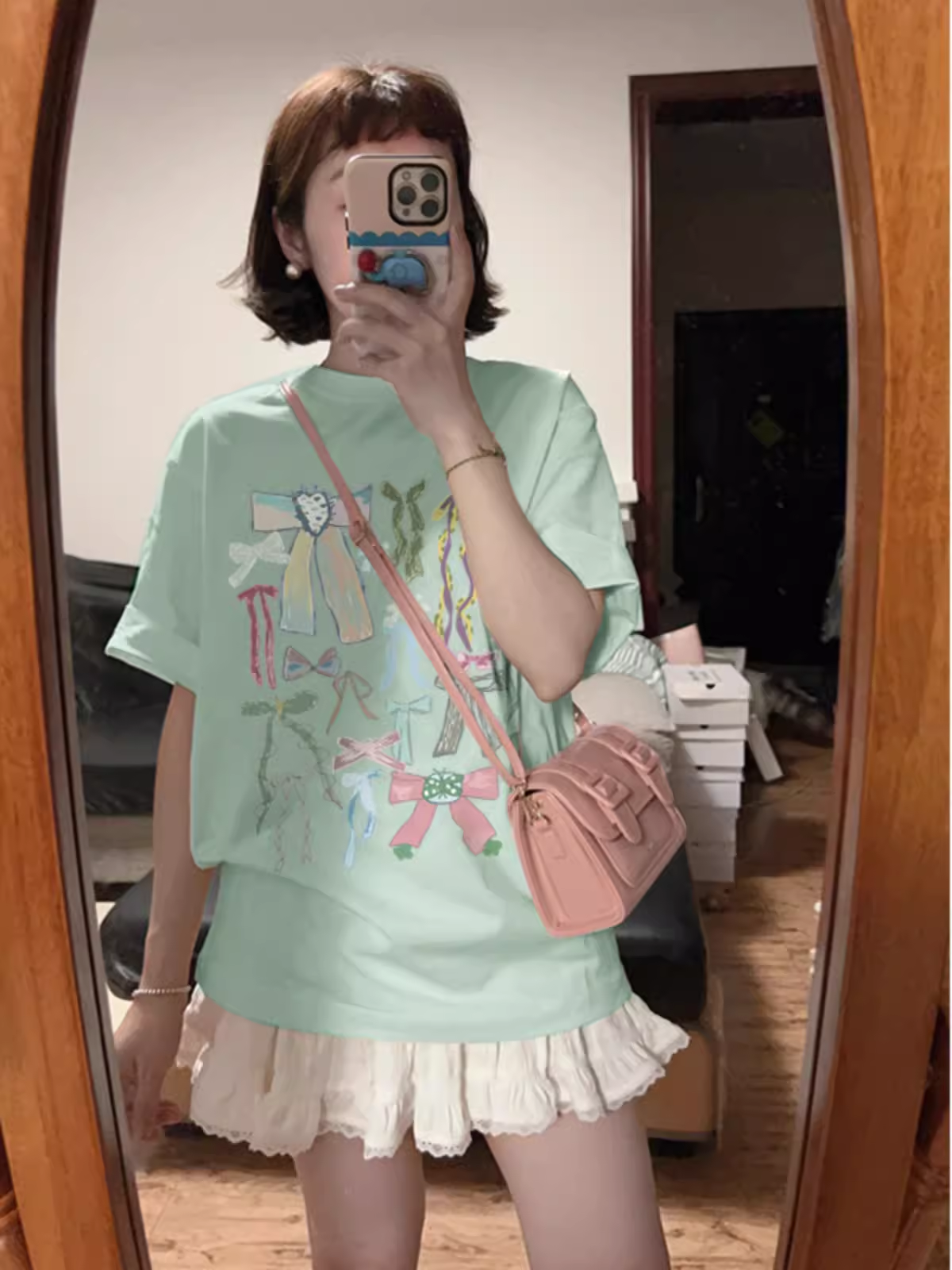 Graffiti print white short-sleeved casual pullover bow
