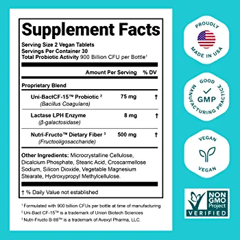Probiotic supplement for digestive health with prebiotic fiber and natural lactase enzyme. 62% more stable formula for gut health support. Vegan blend made in the USA.