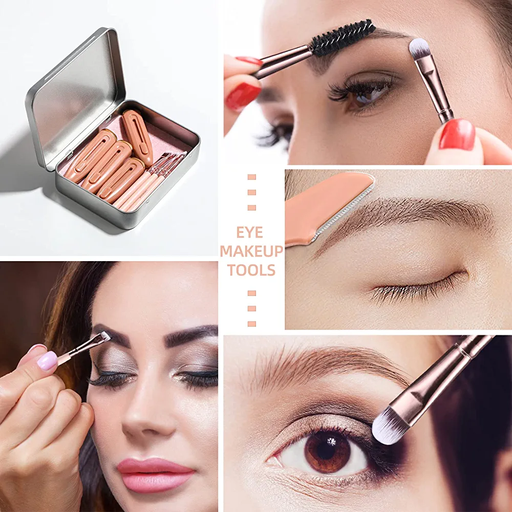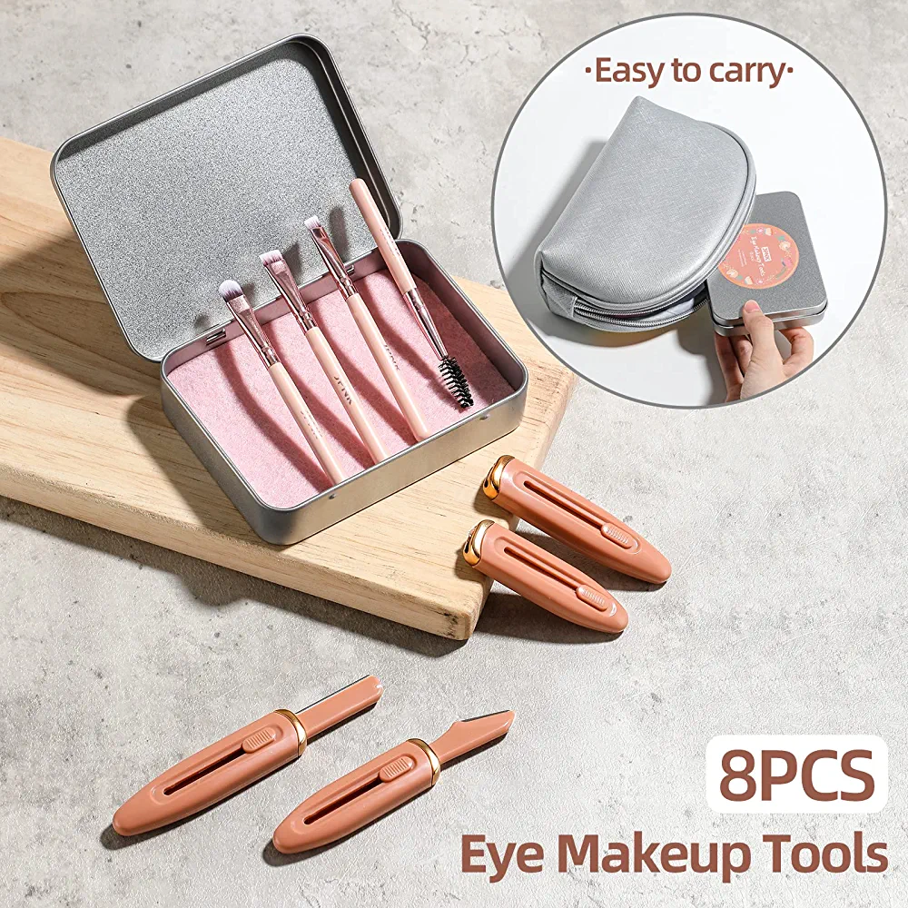 This eyebrow trimming kit includes 8 different tools, such as eyebrow brushes, trimmers, and eyeshadow brushes, to help beginners achieve the perfect eyebrow shape and provide a quick and clean trimming experience. The handle is made of lightweight and non-slip plastic, making it easy to grip and use. These multi-functional tools can remove excess hair without causing any damage to the skin. Additionally, the eyeshadow brush set is perfect for applying eye makeup, including eye shadow, eyeliner, and brow color. The premium synthetic bristles are non-shedding and absorb product easily, allowing for a flawless application without any brush marks. Overall, this kit is easy to carry and use, making it a great addition to any makeup routine.