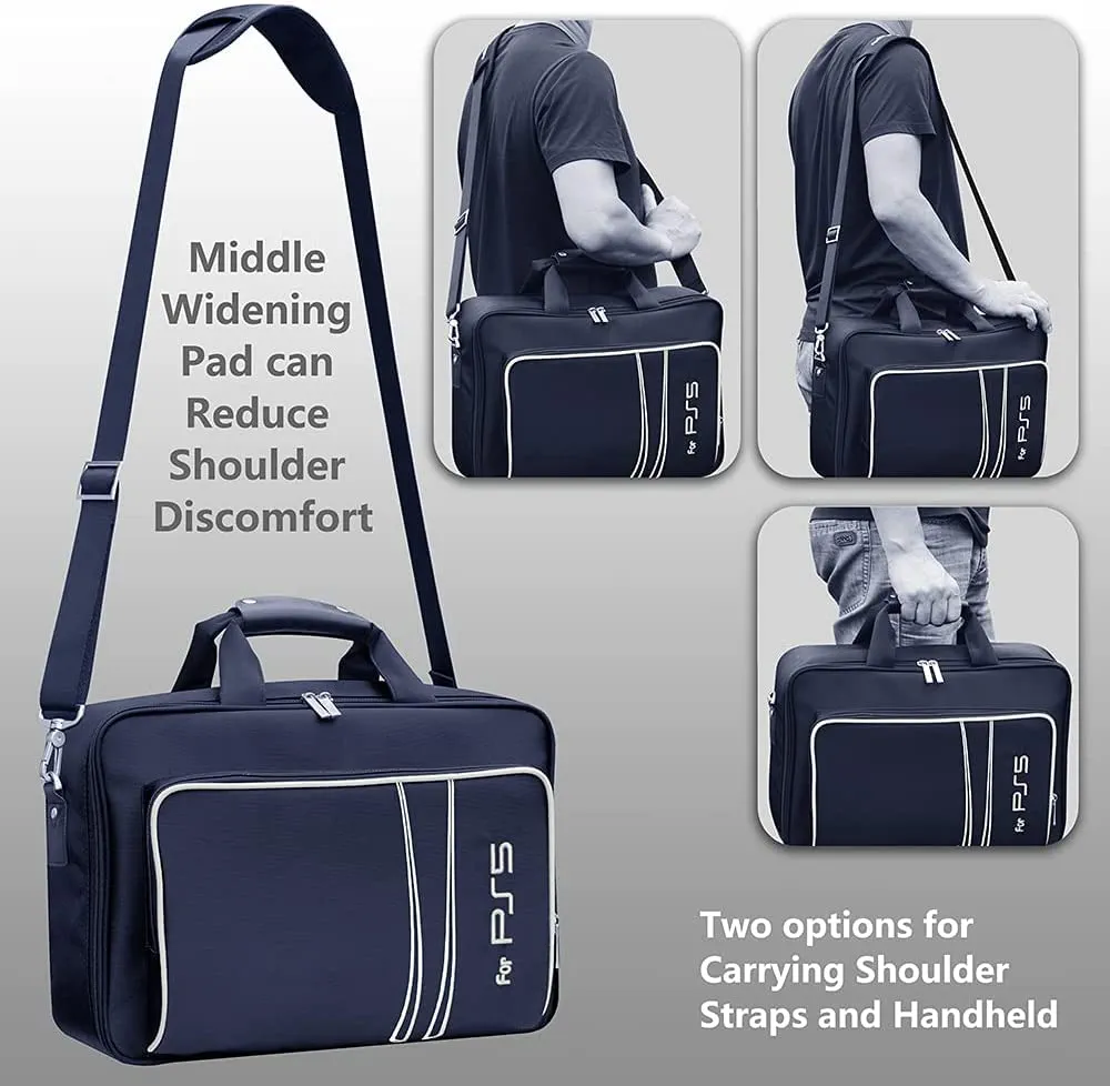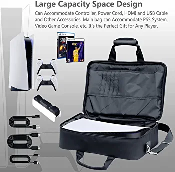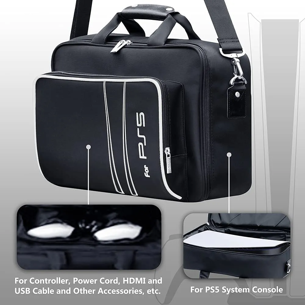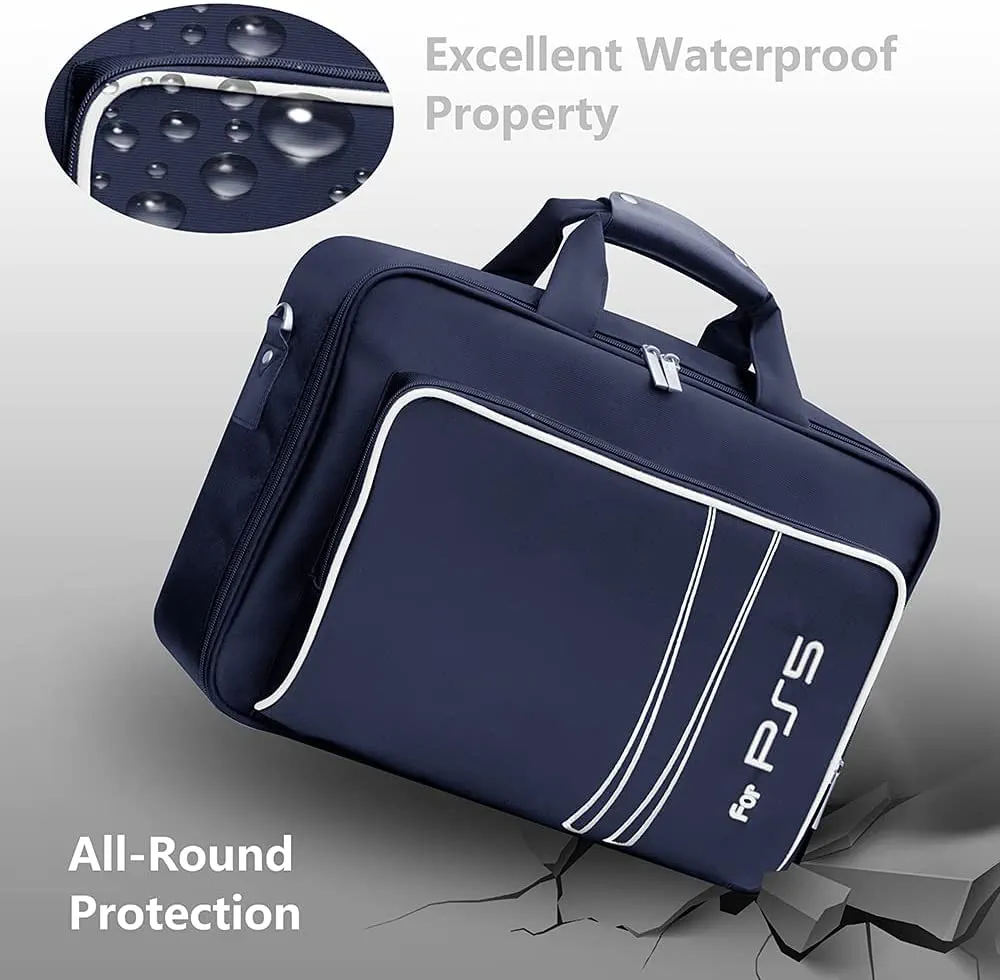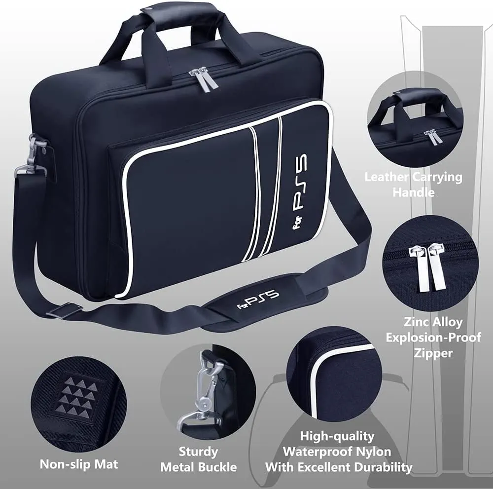 A travel case specially made for PS5 consoles. It is composed of waterproof and durable nylon fabric, high quality, and strong zipper made of zinc alloy. Comes with adjustable shoulder straps and dual gamepad interior pockets. Perfectly protect your ps5 host for travel needs.