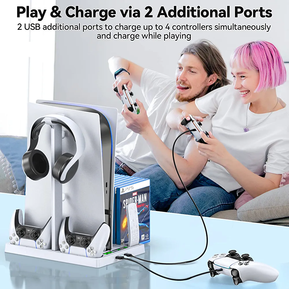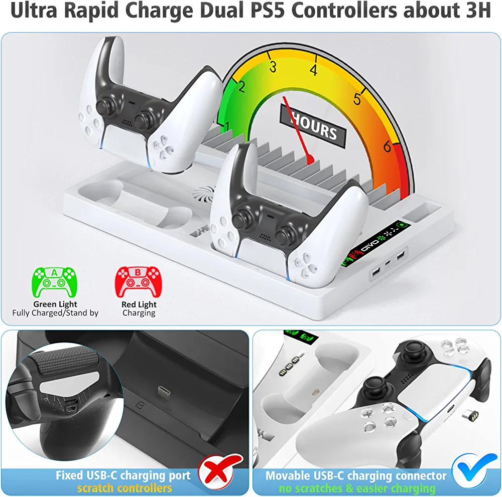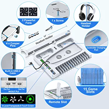 PS5 Cooling Stand with Controller Charger and 3-Level Speeds Cooling Fan, includes 15 Games Organizer & Headset Holder.
