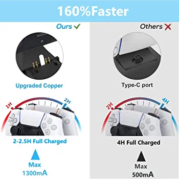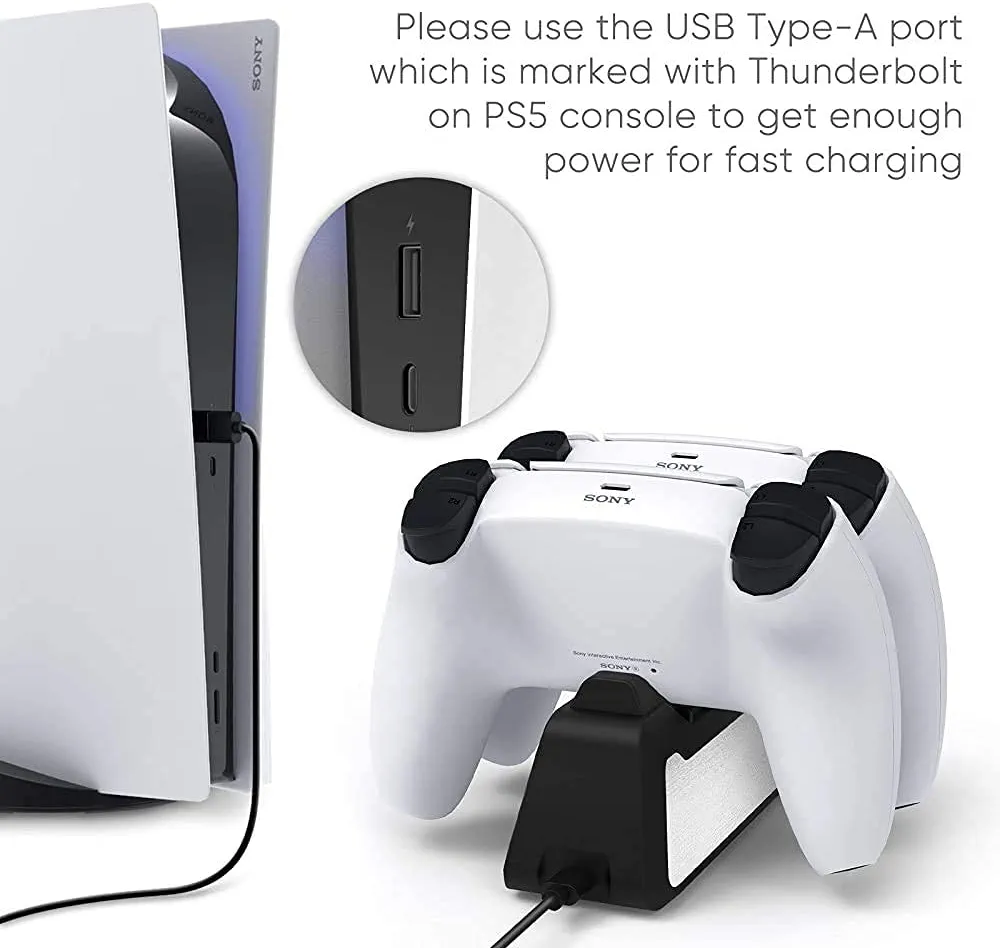 Make sure to use the USB Type-A port that with a thunderbolt mark of your PS5 console to get enough power for fast charging or it will be charged slowly.