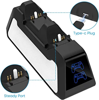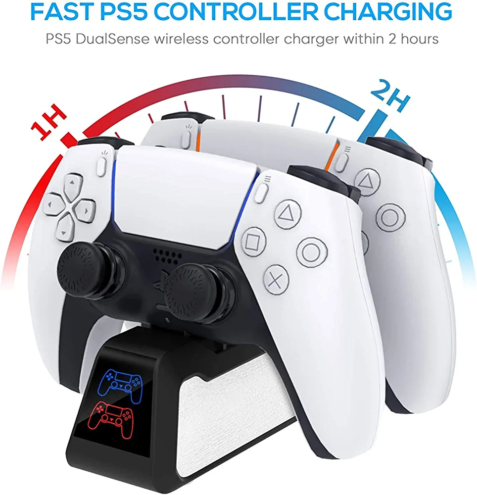Specially Designed for PS5 Controllers, Providing Perfect Protection Convenient Charging Allows to charge or store two PS5 wireless DualSense Controllers simultaneously. It only takes about 2h to get fully charged. Saving your time and get more fun. Plug and Play The charging dock station is easy to use! Simply insert the controller into the slot of this ps5 controller charger to make a stable connection. You can also store your controllers on the dock for easy access. Pillarmax PS5 Controller Charger is a creative charger compatible with the PS-5 wireless controller. The charging station is designed with dual charging, which can fast charge two controllers at the same time. Functional characteristics: Compatible with PS-5 wireless controller;