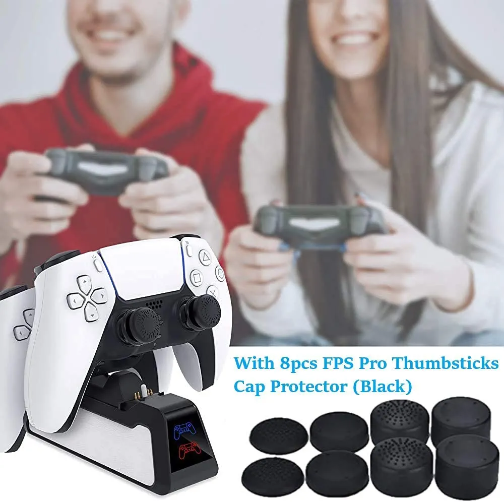 Pillarmax PS5 controller charger is designed for your PS5 Controller, provide an easy and quick way to charge up to two Dual Sense wireless controllers simultaneously, Fully charge two controllers within 2-2.5 hours. With built-in Protecting Chip, never overcharge your controllers even overnight. LED Indicator The red indicator means that charging is in progress and the indicator will be reverted back to blue once fully charged or on standby. Built-in Intelligent Chip Protection A built-in protection chip provides overcharging protection, when it is fully charged, it will automatically disconnect to protect your equipment from potential damage. EXT Port Simply, place 2 controllers onto the dock and start charging With 8 X PS5 Thumb Grip Caps Included High Quality Soft Silicone