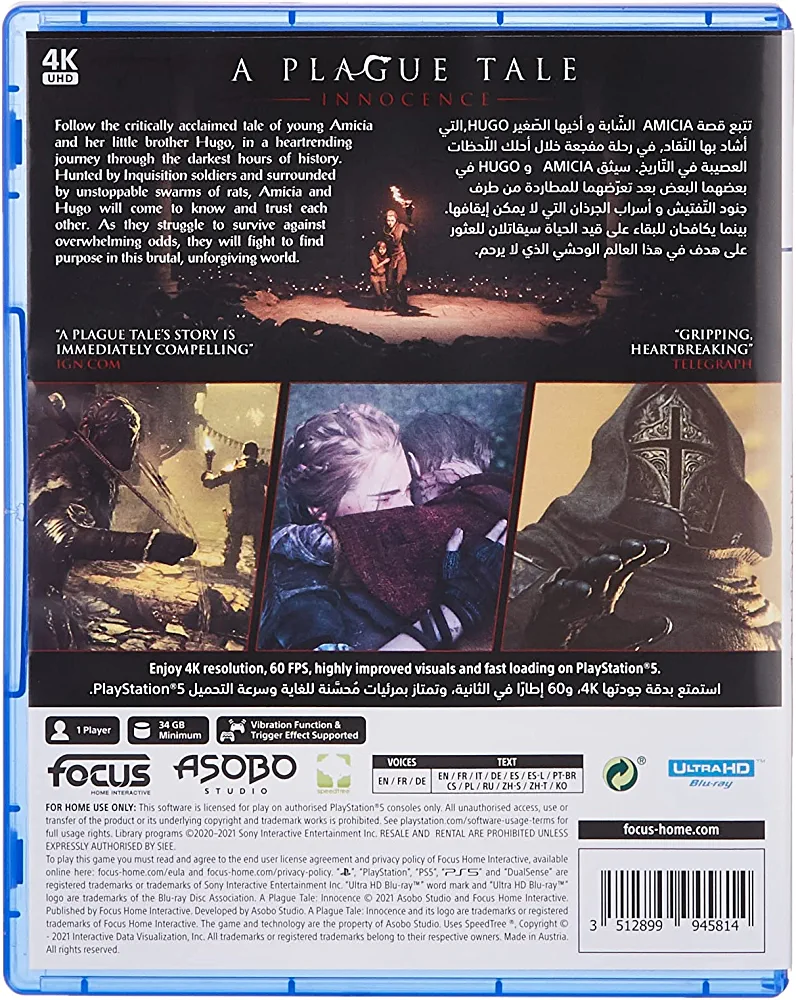 A Plague Tale: Innocence is an immersive and gripping adventure game that takes you on a journey through medieval France during the Black Death. Set in a beautifully crafted world, you play as Amicia, a young girl who must protect her younger brother Hugo from the Inquisition and swarms of deadly rats that have infested the land. With stunning graphics and a captivating storyline, A Plague Tale: Innocence for PS5 will transport you to a world of danger, intrigue, and survival. Experience the thrill of stealth gameplay, solve puzzles, and use your wits to outsmart your enemies and overcome the challenges that lie ahead. Get ready to embark on an unforgettable journey that will test your skills and your courage in equal measure.