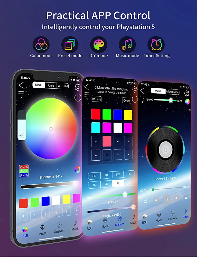 | nameOriginal | LED Lights for Playstation 5 Console, RGB PS5 LED Light DIY Accessories with Bluetooth &Sync Music& 400 Effects 8 Colors for Playstation 5 Console with App Control,Remote, USB 3 Control |
