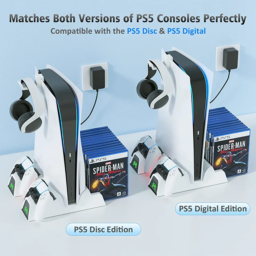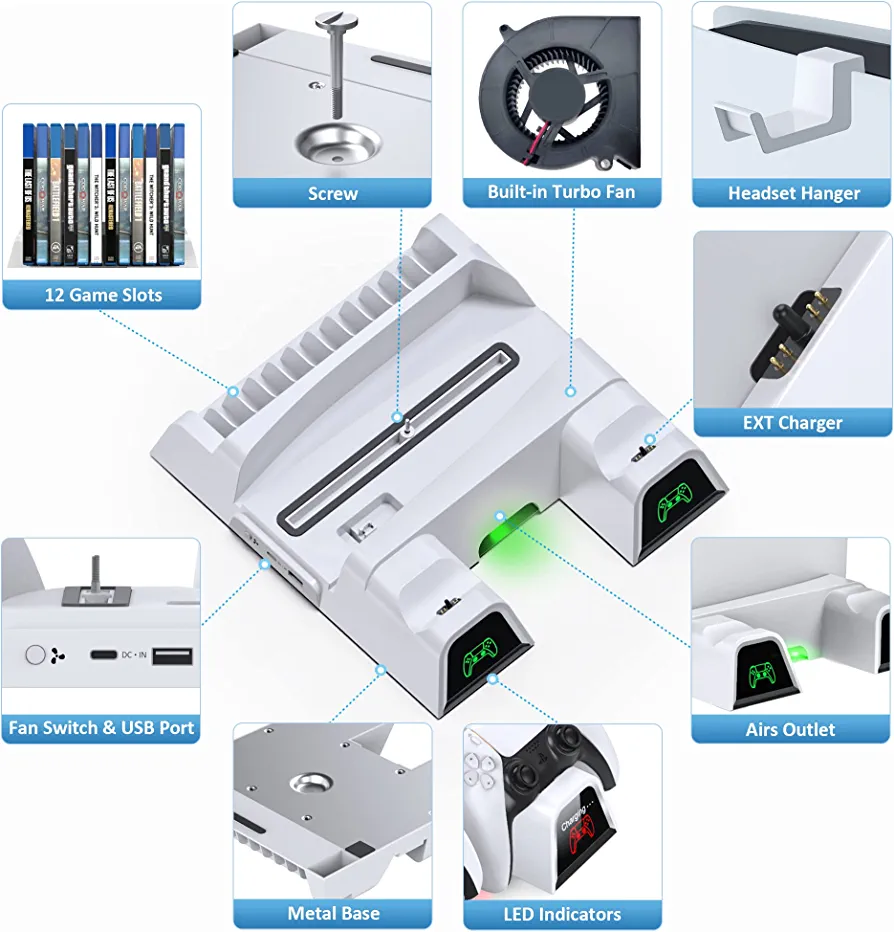 PS5 Stand with Cooling and Charging Station, 12 Slots and Headset Holder.