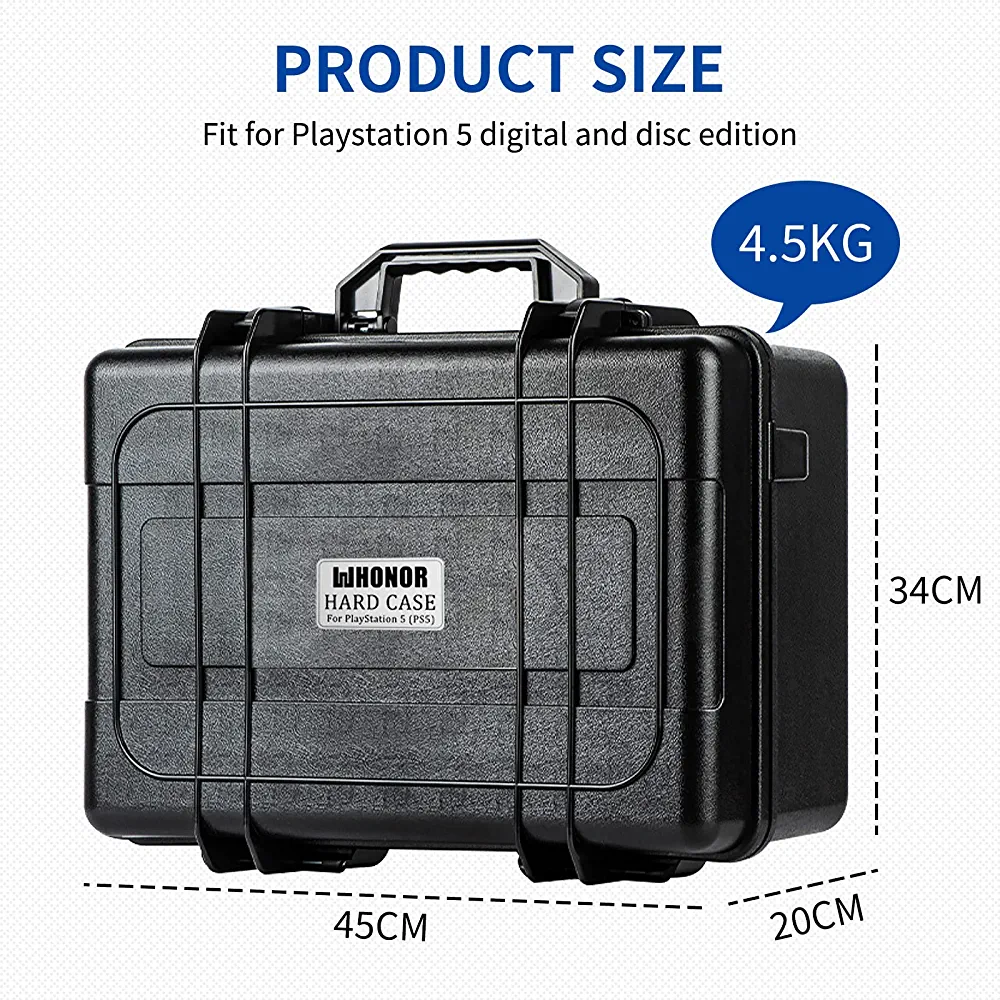 | descriptionOriginal | WHonor Hard Shell PS5 Travel Storage Case – Perfectly Protect Your PS5 This travel case is specially designed for PS5, with the features of waterproof, shock-absorbing, and customized foam interior that will perfectly fit your console, charging base, two controllers, CD's and data cables. A shockproof and crushproof hard shell exterior offers unparalleled impact-resistance for your console and accessories. Material ABS+EVA We understand your console and accessories are important, so invest in a case designed from the ground up to protect them. |