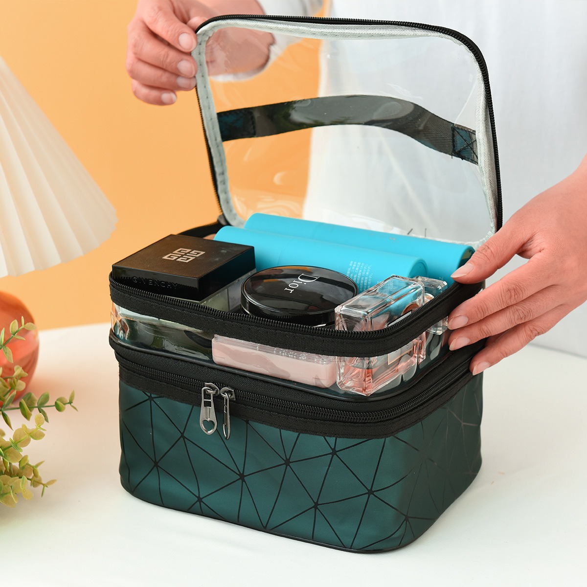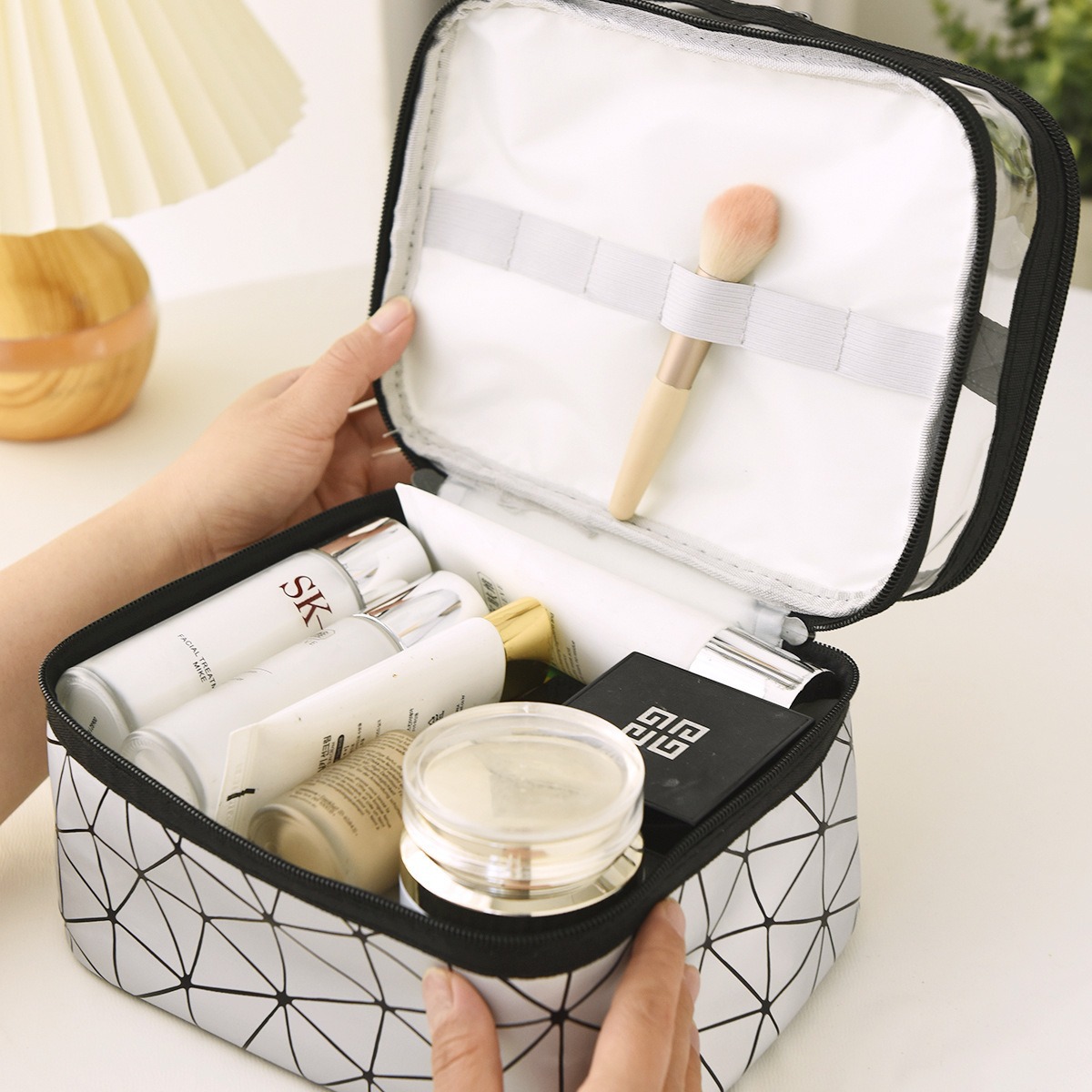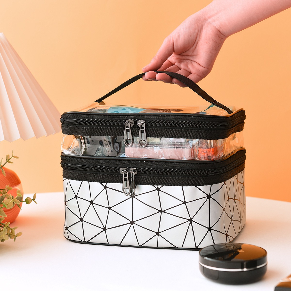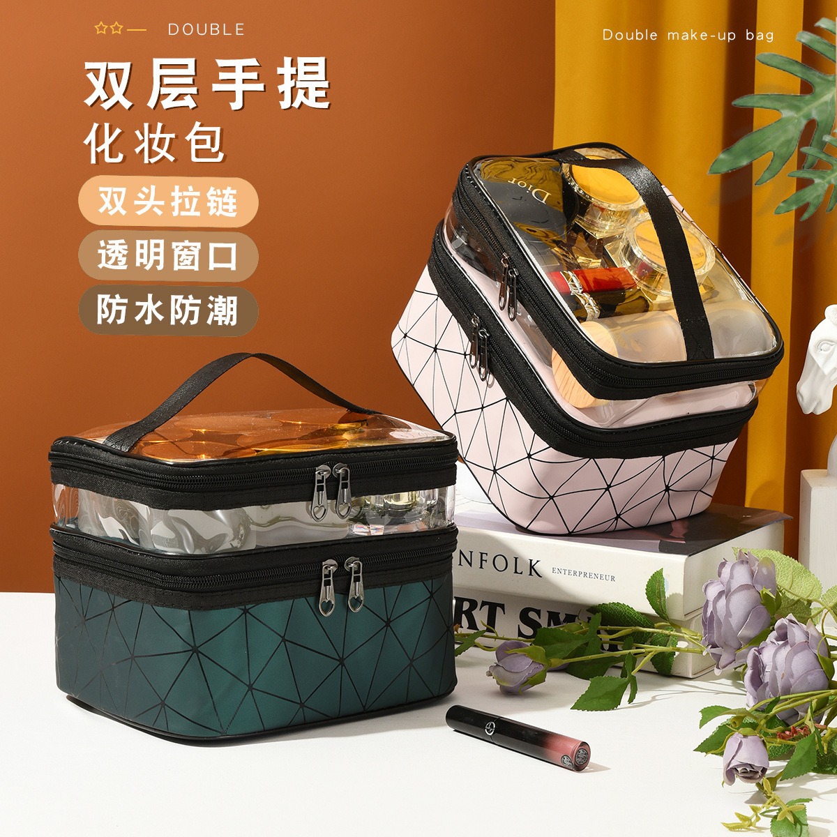 | nameOriginal | PU Waterproof Cosmetic Bag Large Capacity Advanced Sense Double Layer Portable Storage Bag Fashionable Plaid Travel Wash Bag |