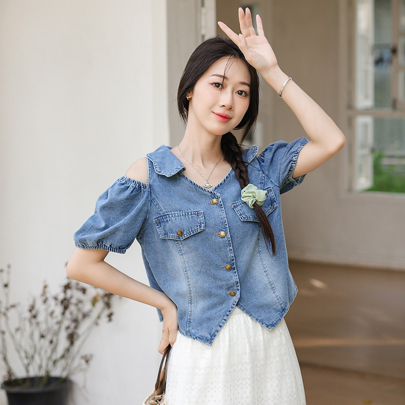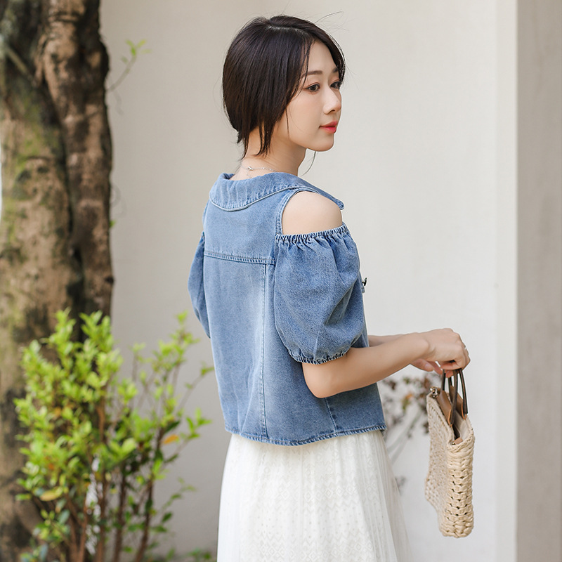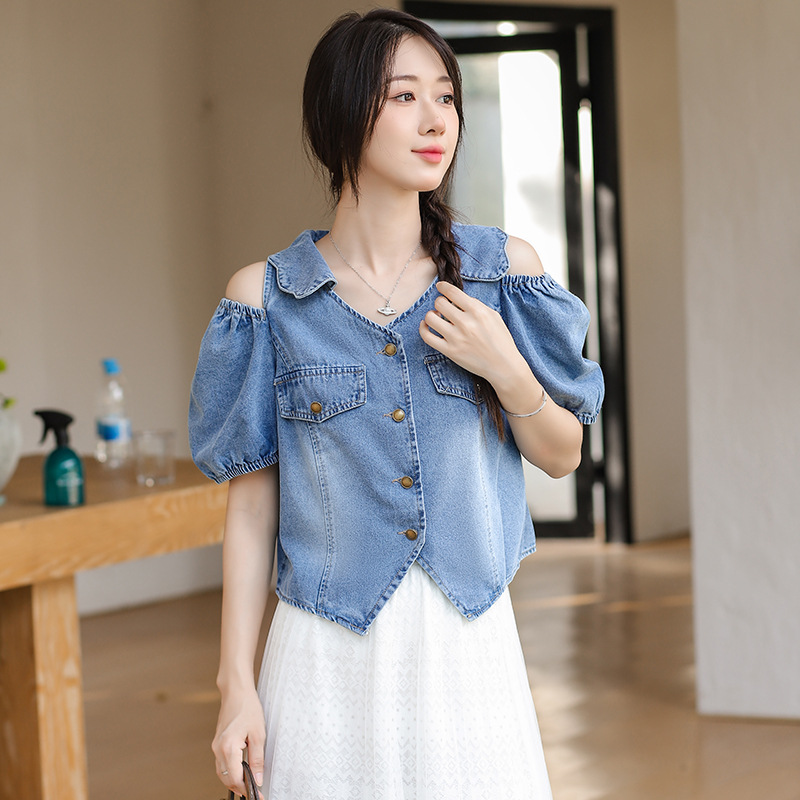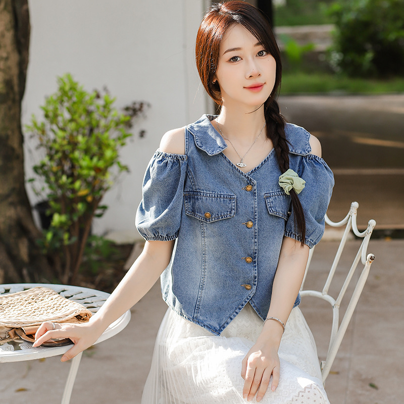 | nameOriginal | Puff Sleeve Off-shoulder Waist Slimming Short Denim Shirt Women's Summer Thin Trendy Top |