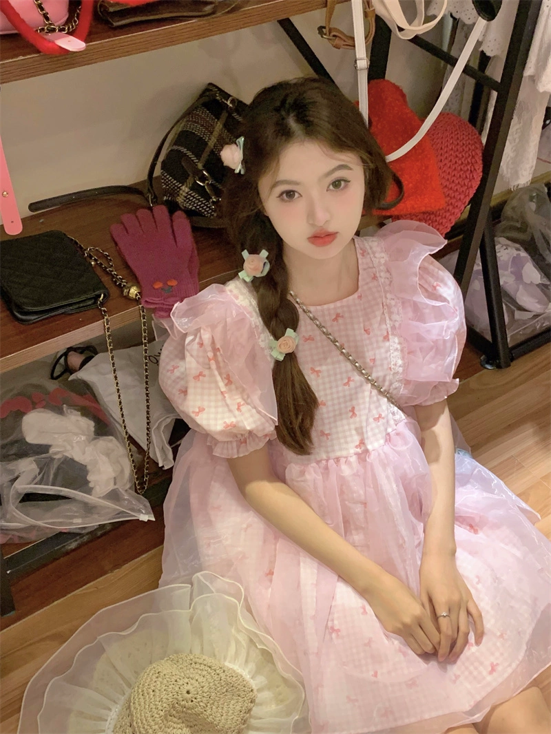| nameOriginal | Puff sleeve summer cute patchwork mesh dress |