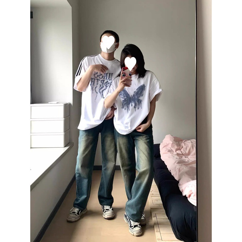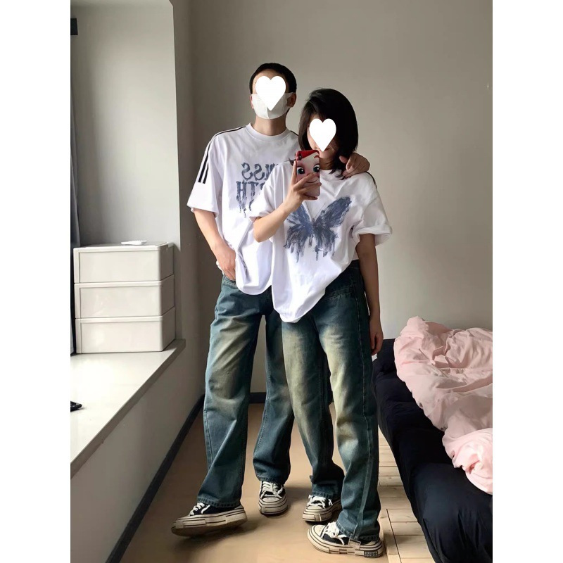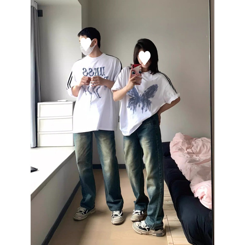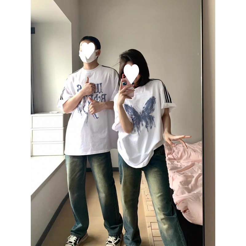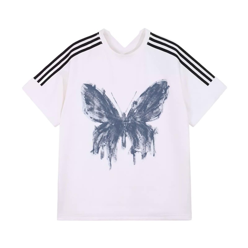 [Pure Cotton] American retro three bars T-shirt loose summer short sleeve 2024 new butterfly letters