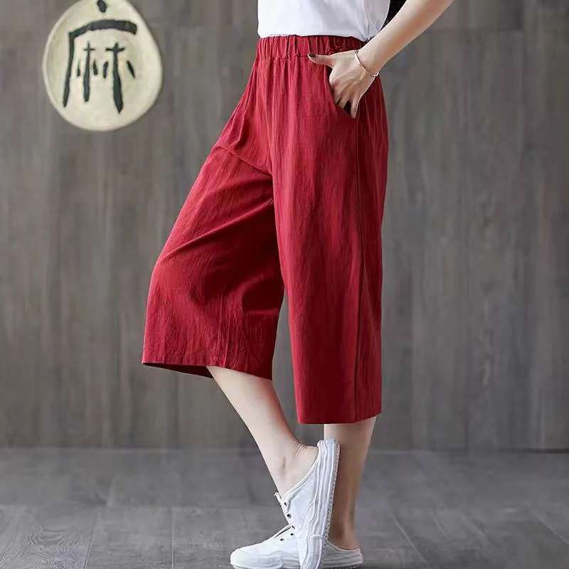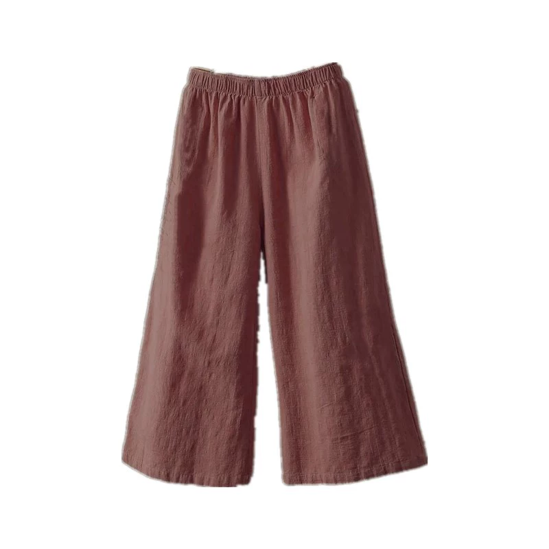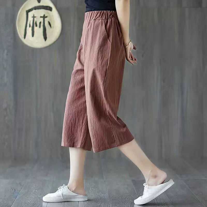 Pure cotton and linen large size summer loose wide leg cropped pants