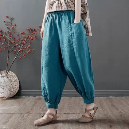 Pure cotton and linen casual high waist beam lanterns nine -point literary art